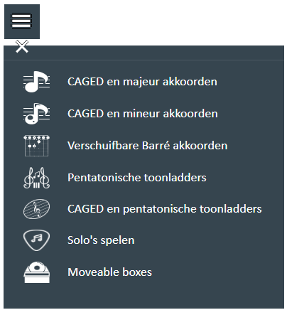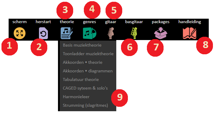 3 | De eerste theoriemodule in de applicatie, waarin de basis muziekleer de revue passeert. Er zijn in totaal 8 studieblokken, die het beste achter elkaar gevolgd kunnen worden. Wat de gebruiker al beheerst kun je natuurlijk overslaan. Dit is ook een wisselbutton. Bij de eerste keer klikken verschijnt het dropdown menu, bij de tweede keer klikken wordt het dropdown menu weer gesloten. | |