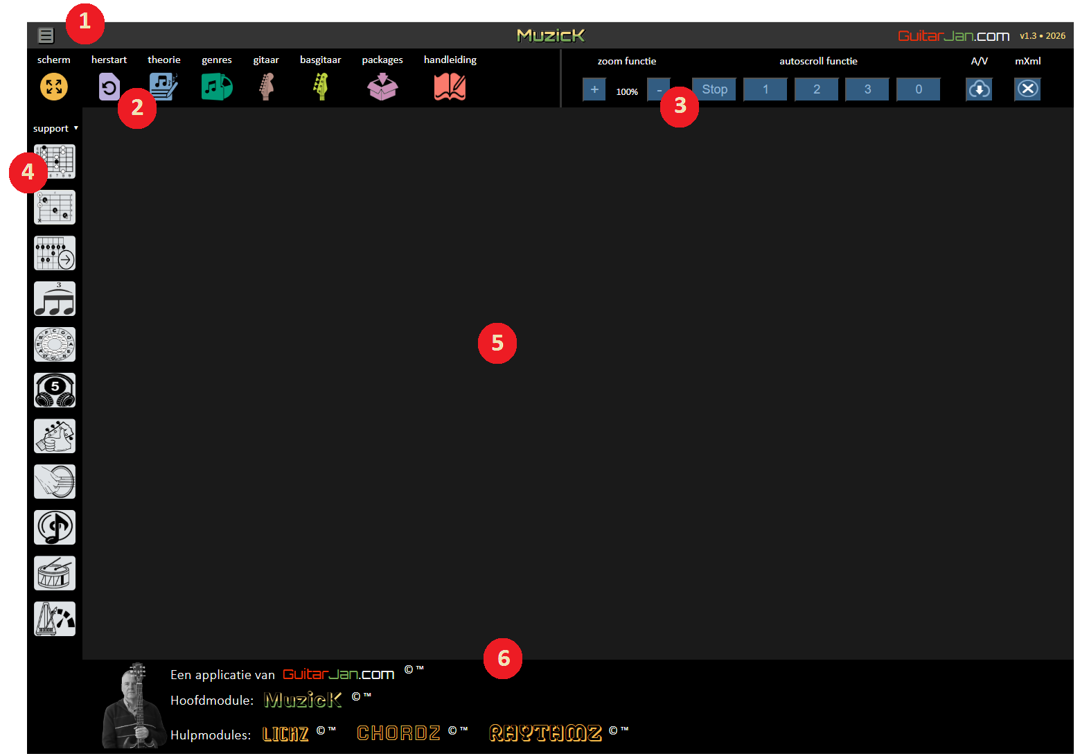 6 | De voettekst van de applicatie, waarin getoond wordt welke applicaties er binnen de totale "MuzicK" applicatie nog meer worden gebruikt. |