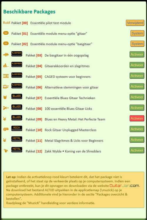 7 | Met een technische term noemen we dit de "Package Handler Module", waarmee de gebruiker bepaalde packages (studiemodules) kan activeren. De meeste studiemodules zijn op één specifiek onderwerp gefocust, en bevatten meestal tientallen videolessen, audiobestanden, tabulaturen, soms Guitar Pro 8 tabulatuurbestanden etcetera. De "Package Handler Module", en de "Package Loader Module" leggen we verderop in deze handleiding uit. | |