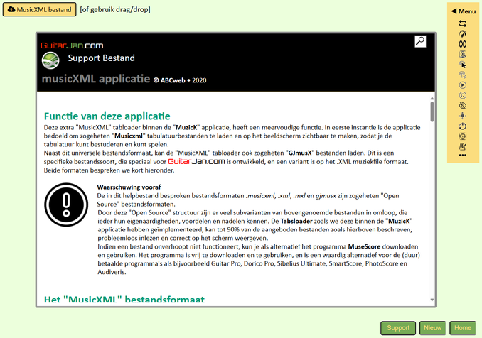 bekend van programma's als bijvoorbeeld MuseScore. Dit enigzins exotische formaat vindt men inmiddels terug in steeds meer programma's.Omdat veel gebruikers nog relatief onbekend zijn met dit bestandsformaat is er een uitgebreide helpfunctie toegevoegd, die gestart wordt met het klikken op de "support" button. Het geopende support-bestand in de applicatie is op de afbeelding hiernaast zichtbaar. |