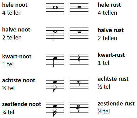 Hiernaast zie je hoe de verschillende soorten noten heten en hoelang ze duren in een vierkwartsmaat. Een vierkwartsmaat is een maatsoort (daarop