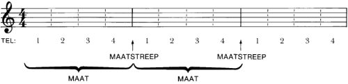 komen we later nog terug), waarin 4 tellen zitten, die ieder een kwart van de volledige maat uitmaken, en dat ziet er in notenschrift