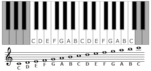 speelt als je alleen de witte toetsen van een piano speelt. Zoals je weet heeft een piano heel veel witte toetsen, dus zou je een notenbalk