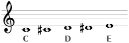Een kruis voor een noot betekent dat we die noot een halve toon hoger moeten spelen. Als we dan alle tonen van de C naar de E
