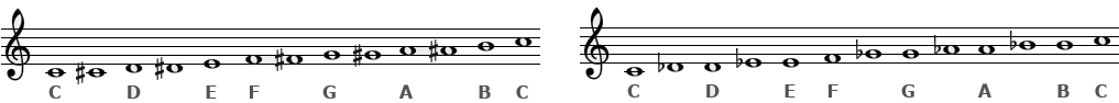 We kunnen nu alle opeenvolgende noten vanaf de C opschrijven, hetzij met kruizen, hetzij met mollen: