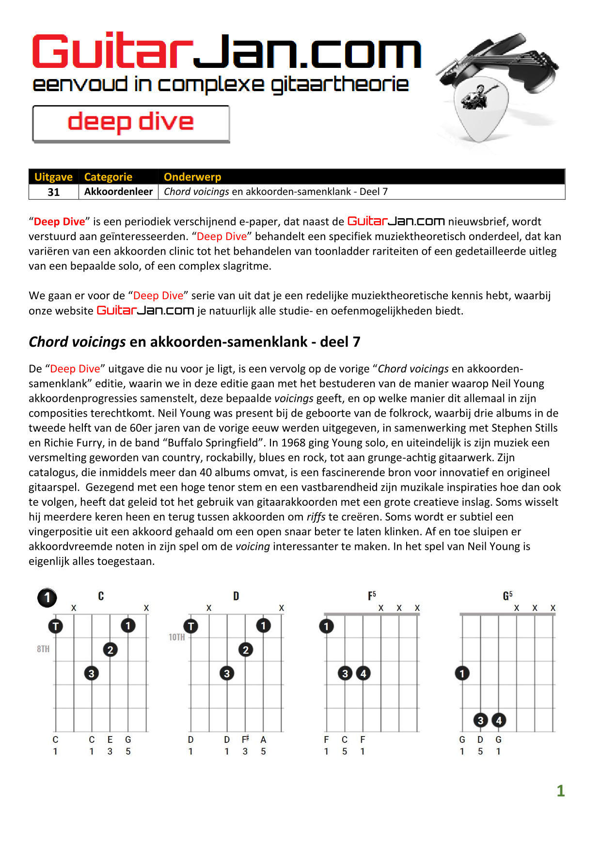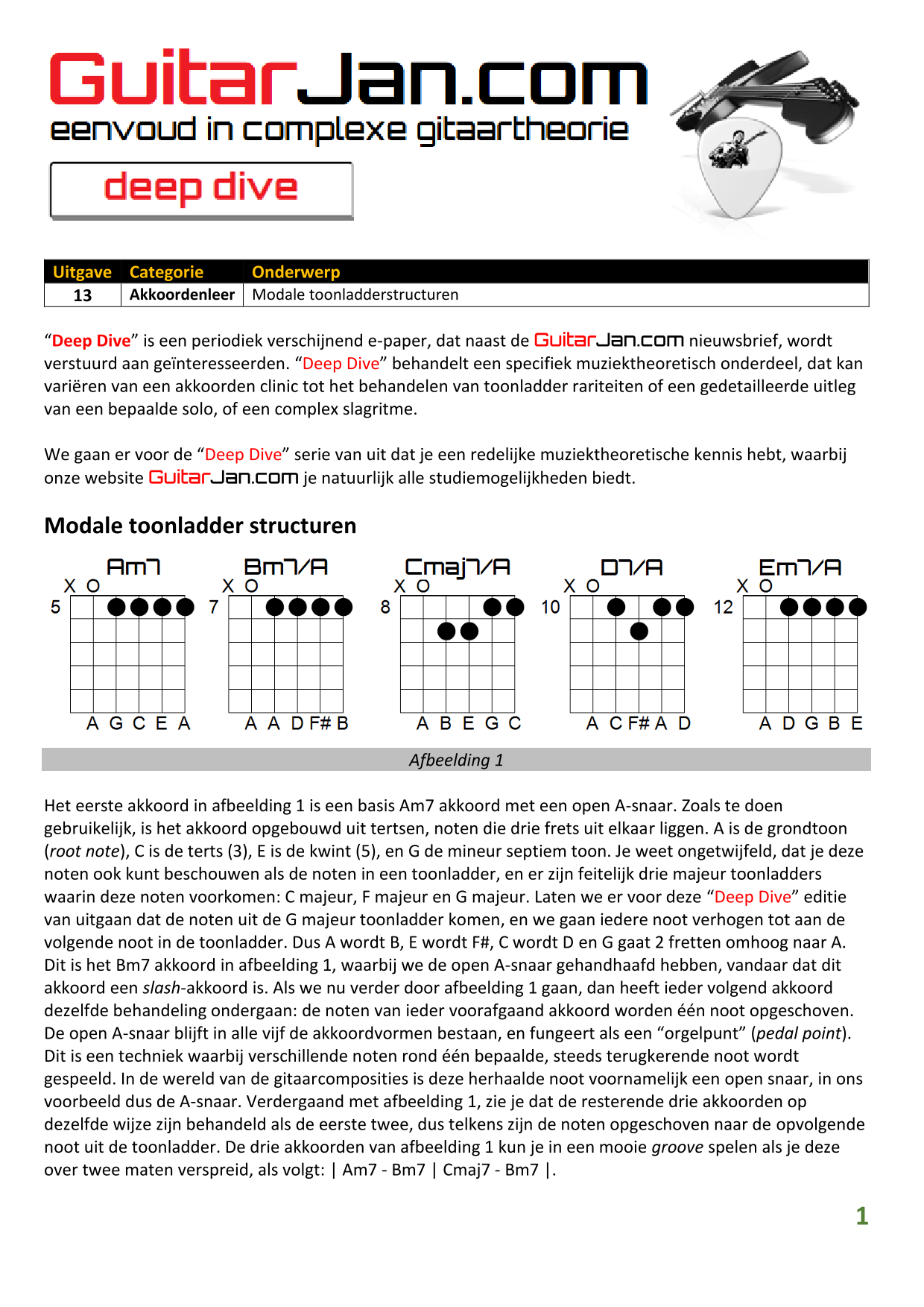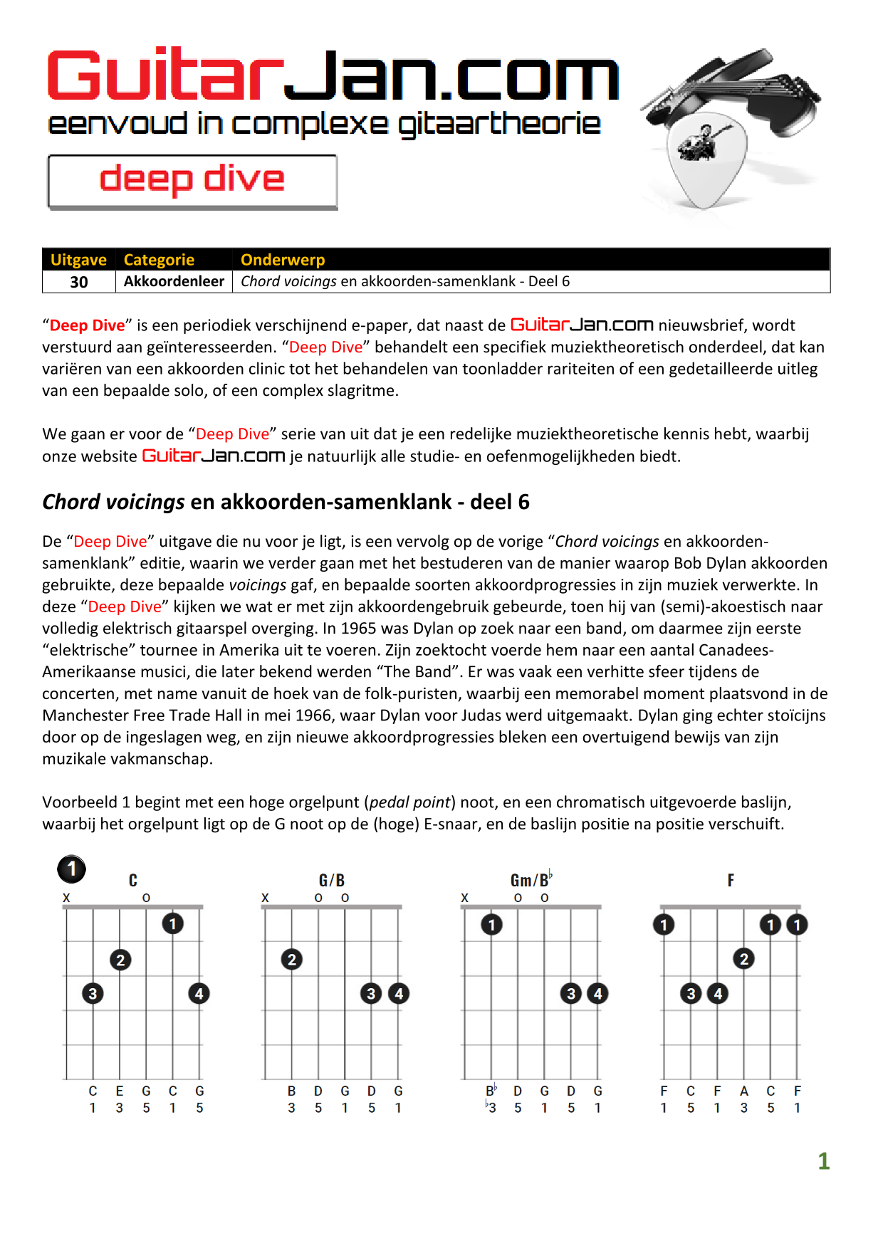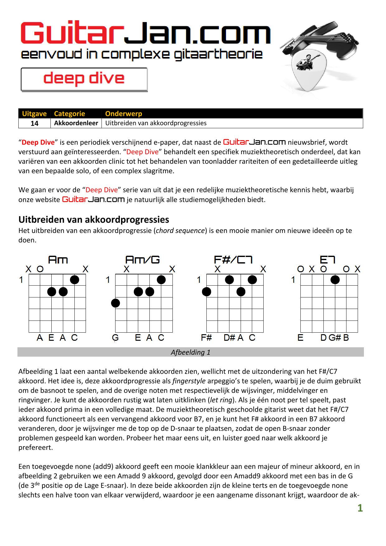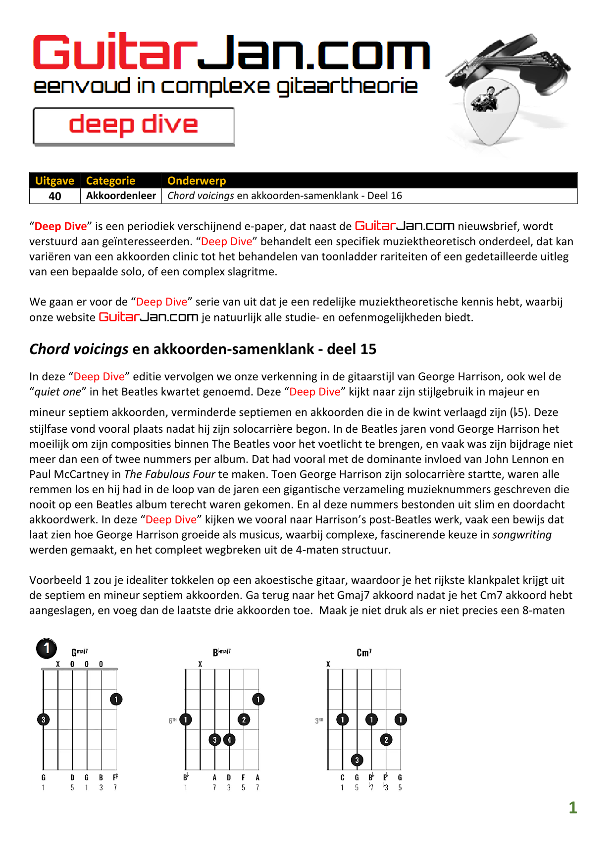 01 Akkoorden in hoge posities - Deel 1 02 Vermeerderde (augmented) akkoorden 03 Verminderde (diminished) septiemakkoorden 04 Twee-vinger akkoorden 05 Akkoorden in hoge posities - Deel 2 06 None (9) en undecime (11) akkoorden 07 Uitgestelde (suspended) akkoorden 08 7#5 (aug) akkoorden 09 Tredecime (13) akkoorden 10 Funky stemvoering 11 alternatieve Blues stemvoering 12 Verschuifbare akkoordvormen (Shapes) 13 Modale toonladderstructuren 14 Uitbreiden van akkoordprogressies