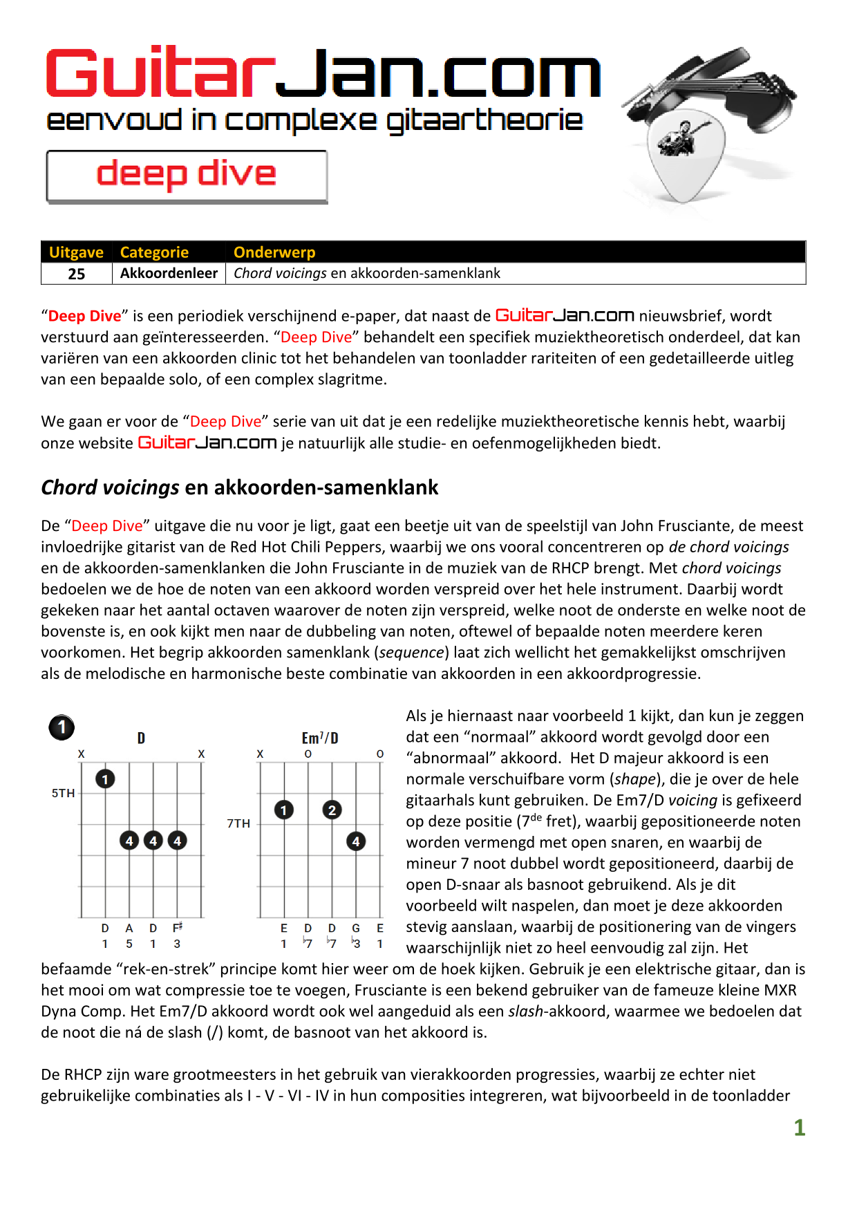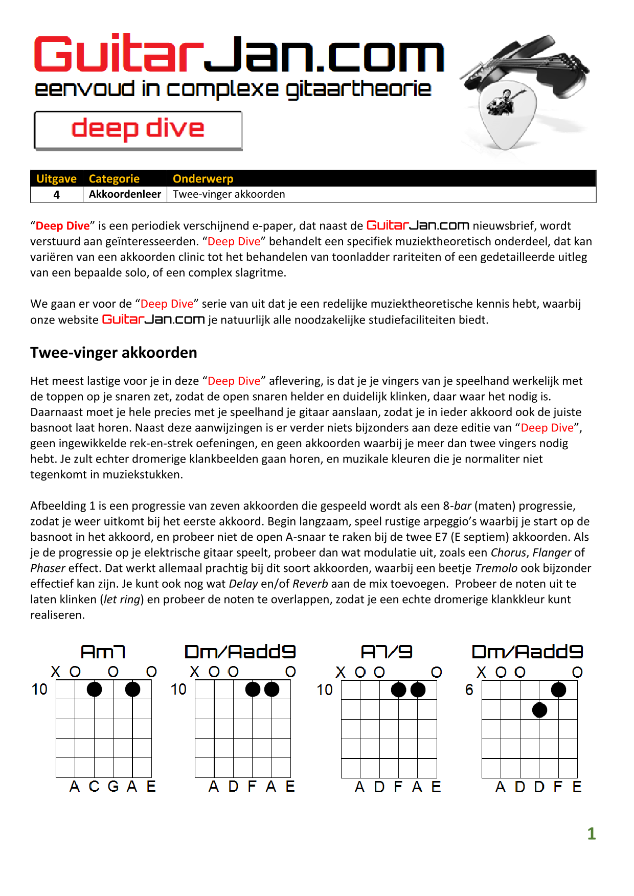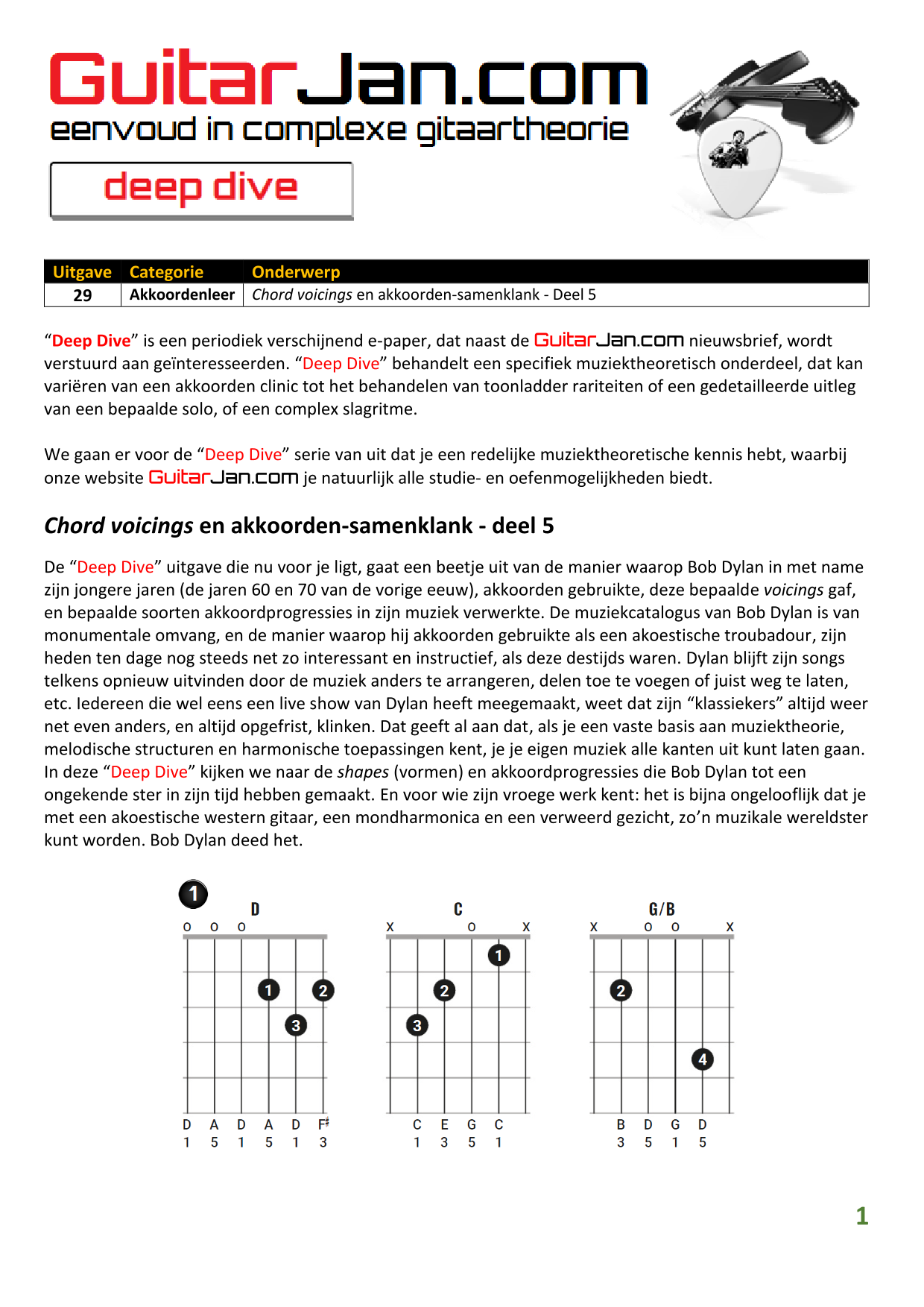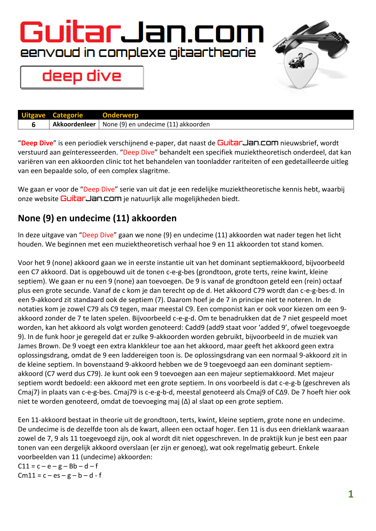 01 Akkoorden in hoge posities - Deel 1 02 Vermeerderde (augmented) akkoorden 03 Verminderde (diminished) septiemakkoorden 04 Twee-vinger akkoorden 05 Akkoorden in hoge posities - Deel 2 06 None (9) en undecime (11) akkoorden 07 Uitgestelde (suspended) akkoorden 08 7#5 (aug) akkoorden 09 Tredecime (13) akkoorden 10 Funky stemvoering 11 alternatieve Blues stemvoering 12 Verschuifbare akkoordvormen (Shapes) 13 Modale toonladderstructuren 14 Uitbreiden van akkoordprogressies