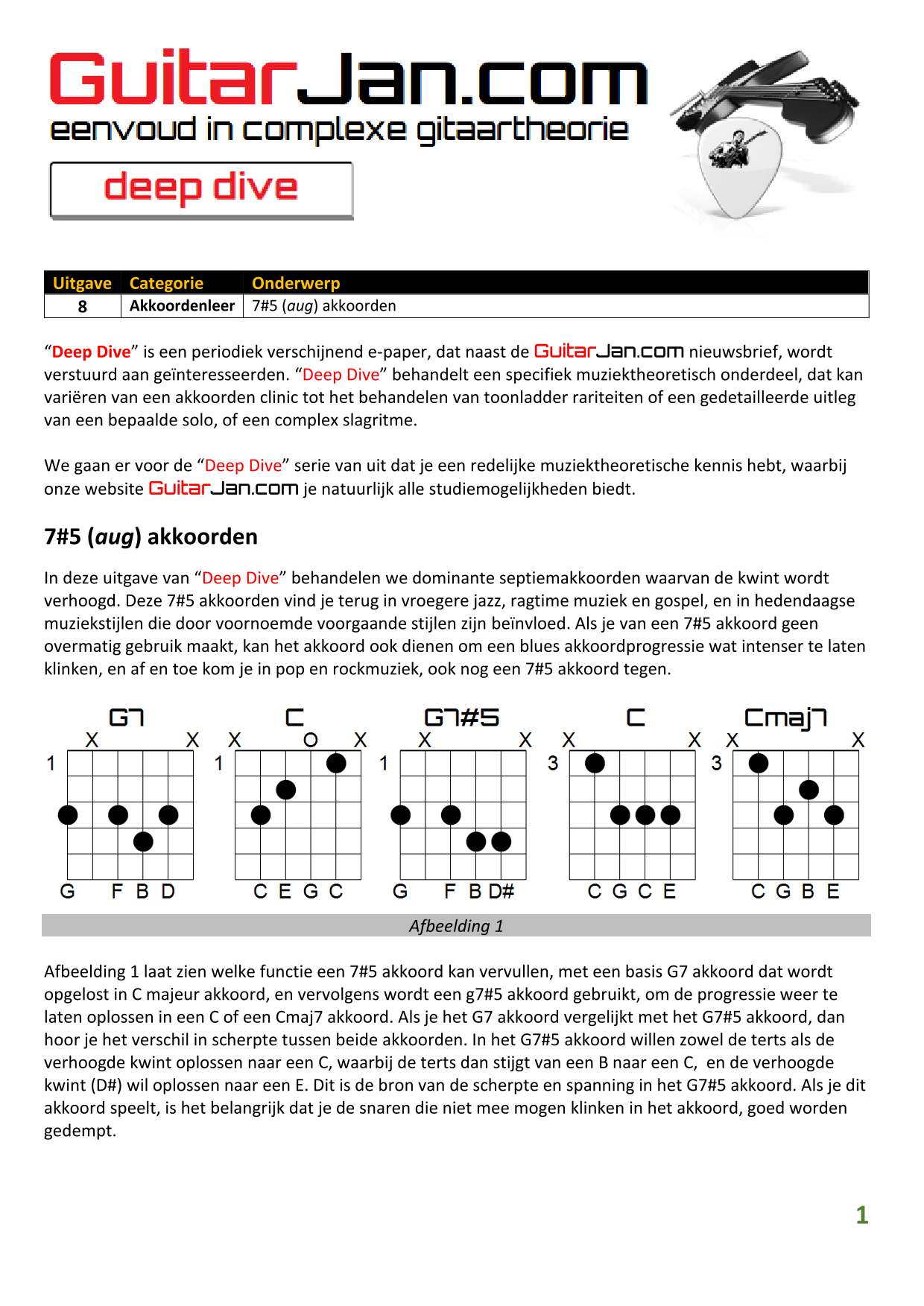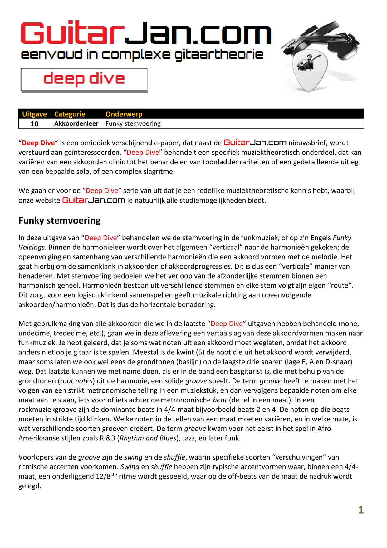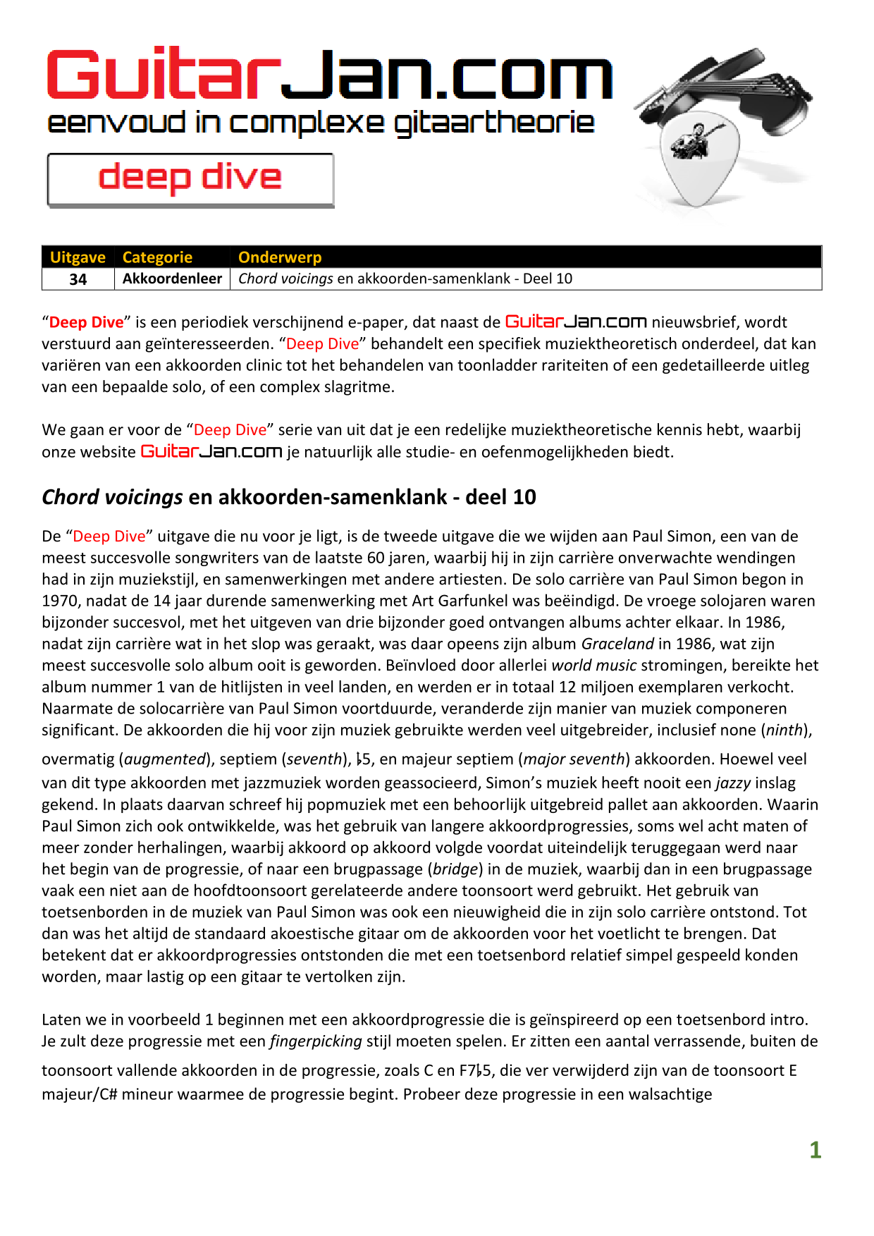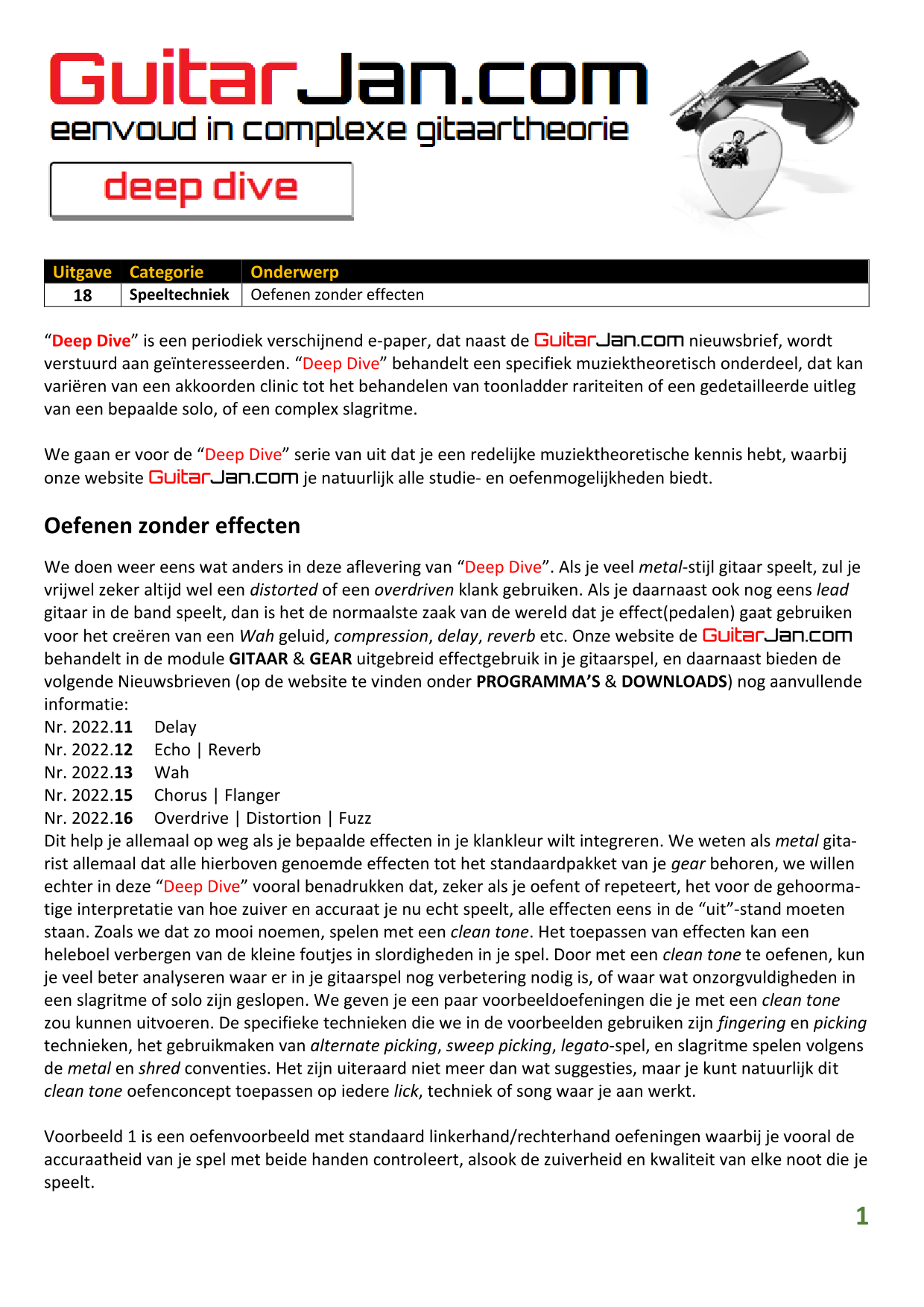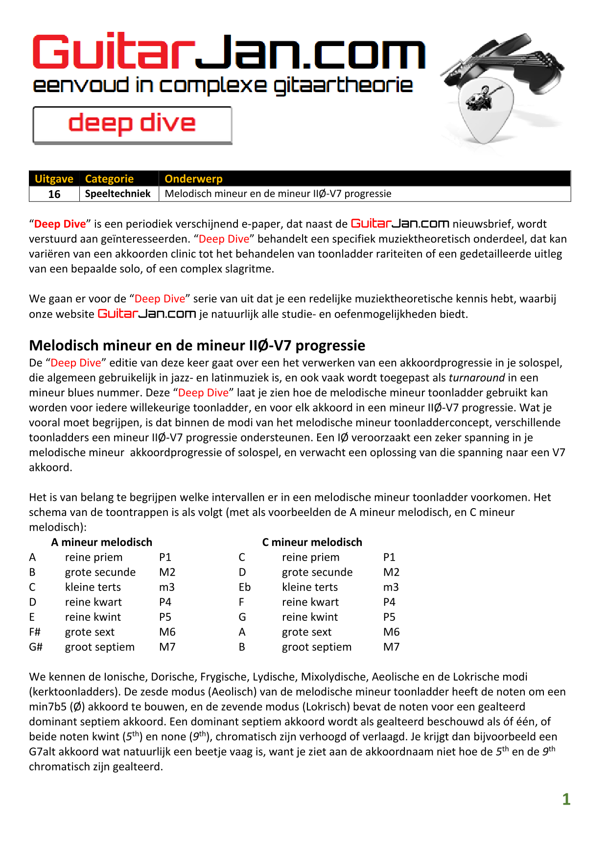 01 Akkoorden in hoge posities - Deel 1 02 Vermeerderde (augmented) akkoorden 03 Verminderde (diminished) septiemakkoorden 04 Twee-vinger akkoorden 05 Akkoorden in hoge posities - Deel 2 06 None (9) en undecime (11) akkoorden 07 Uitgestelde (suspended) akkoorden 08 7#5 (aug) akkoorden 09 Tredecime (13) akkoorden 10 Funky stemvoering 11 alternatieve Blues stemvoering 12 Verschuifbare akkoordvormen (Shapes) 13 Modale toonladderstructuren 14 Uitbreiden van akkoordprogressies
