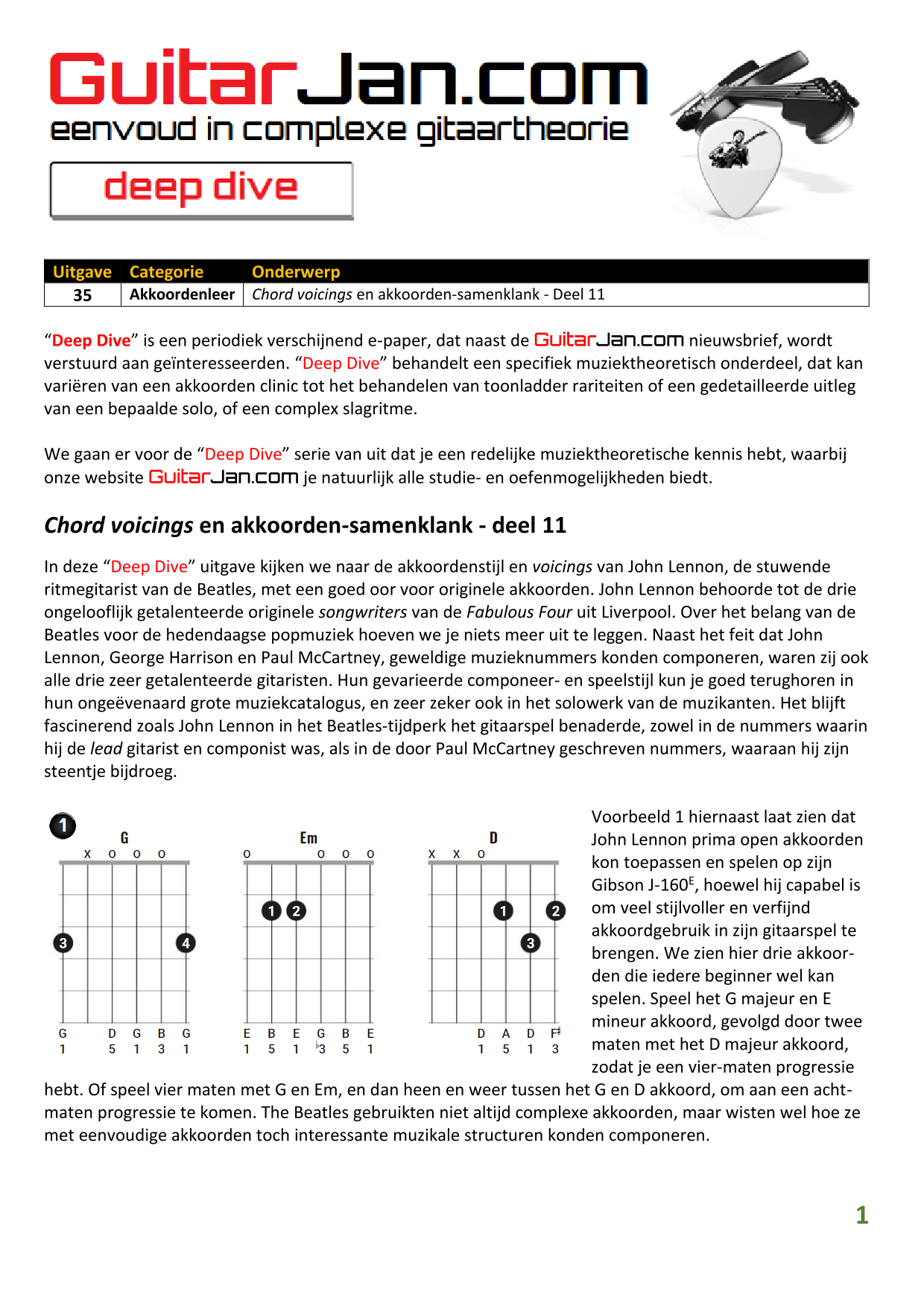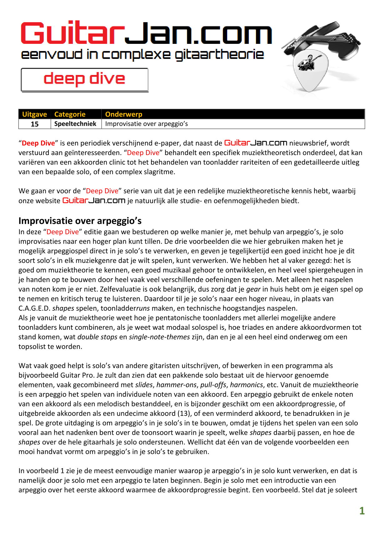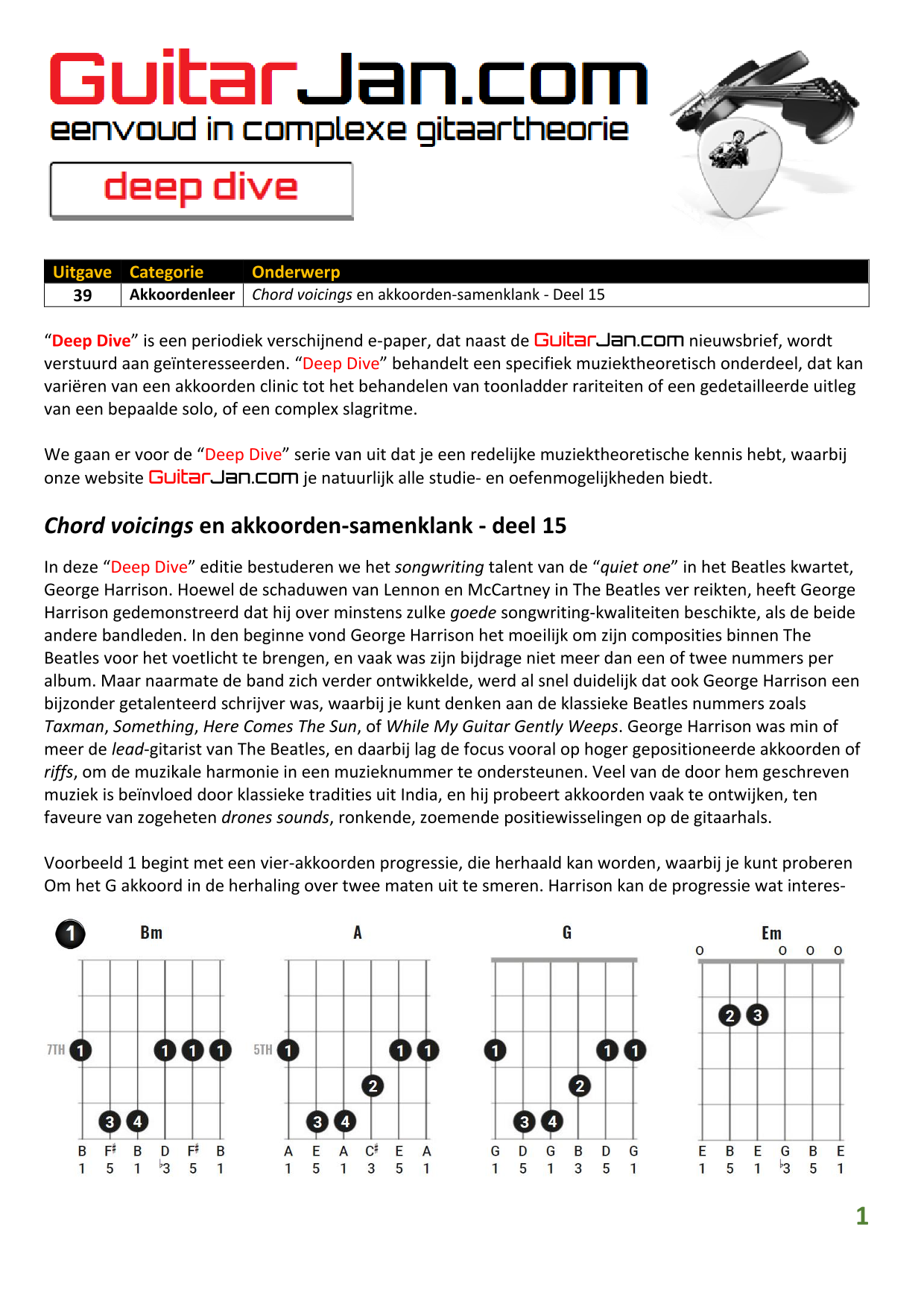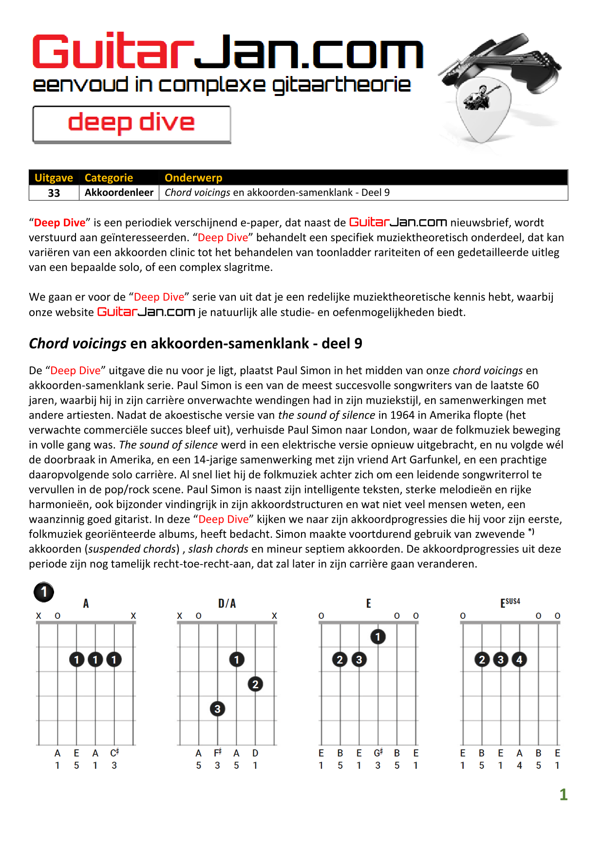 01 Akkoorden in hoge posities - Deel 1 02 Vermeerderde (augmented) akkoorden 03 Verminderde (diminished) septiemakkoorden 04 Twee-vinger akkoorden 05 Akkoorden in hoge posities - Deel 2 06 None (9) en undecime (11) akkoorden 07 Uitgestelde (suspended) akkoorden 08 7#5 (aug) akkoorden 09 Tredecime (13) akkoorden 10 Funky stemvoering 11 alternatieve Blues stemvoering 12 Verschuifbare akkoordvormen (Shapes) 13 Modale toonladderstructuren 14 Uitbreiden van akkoordprogressies