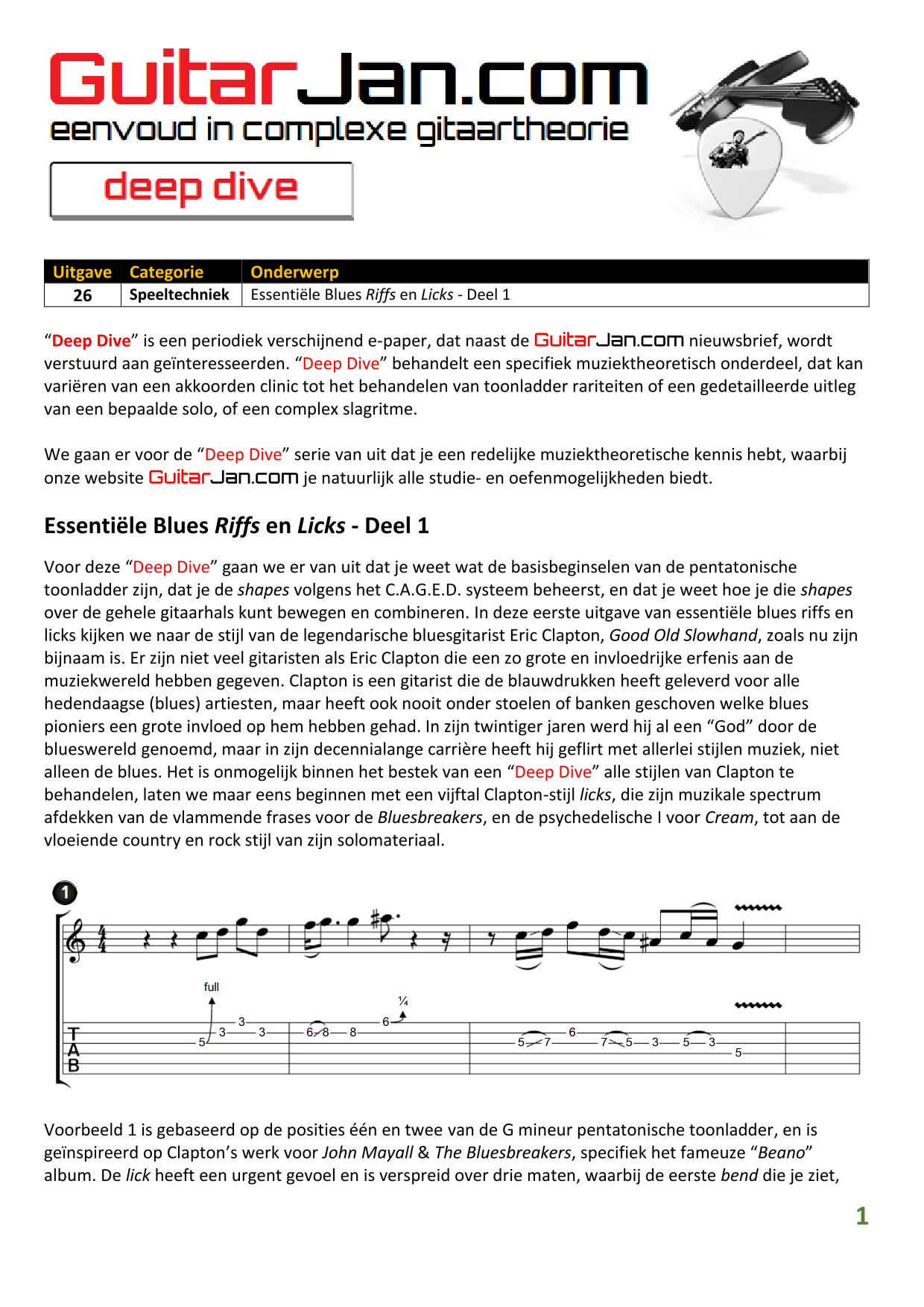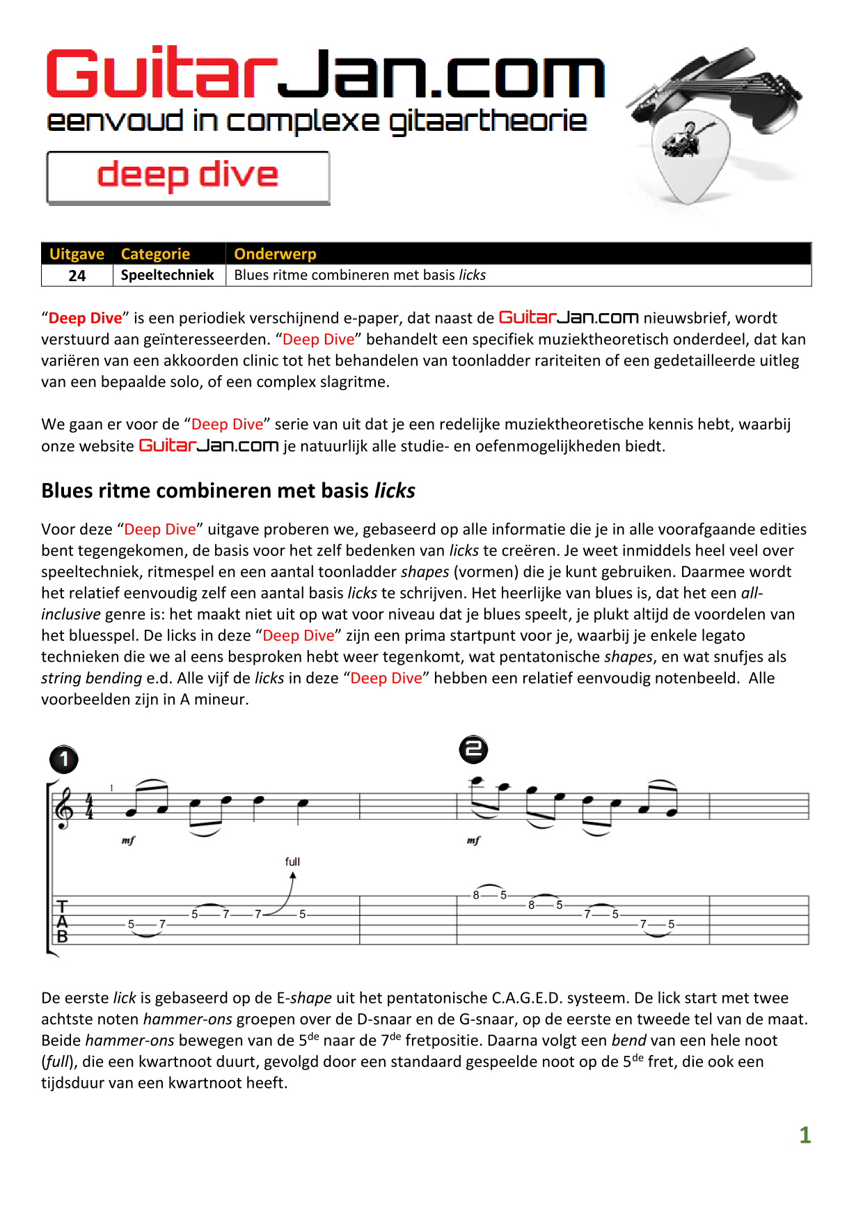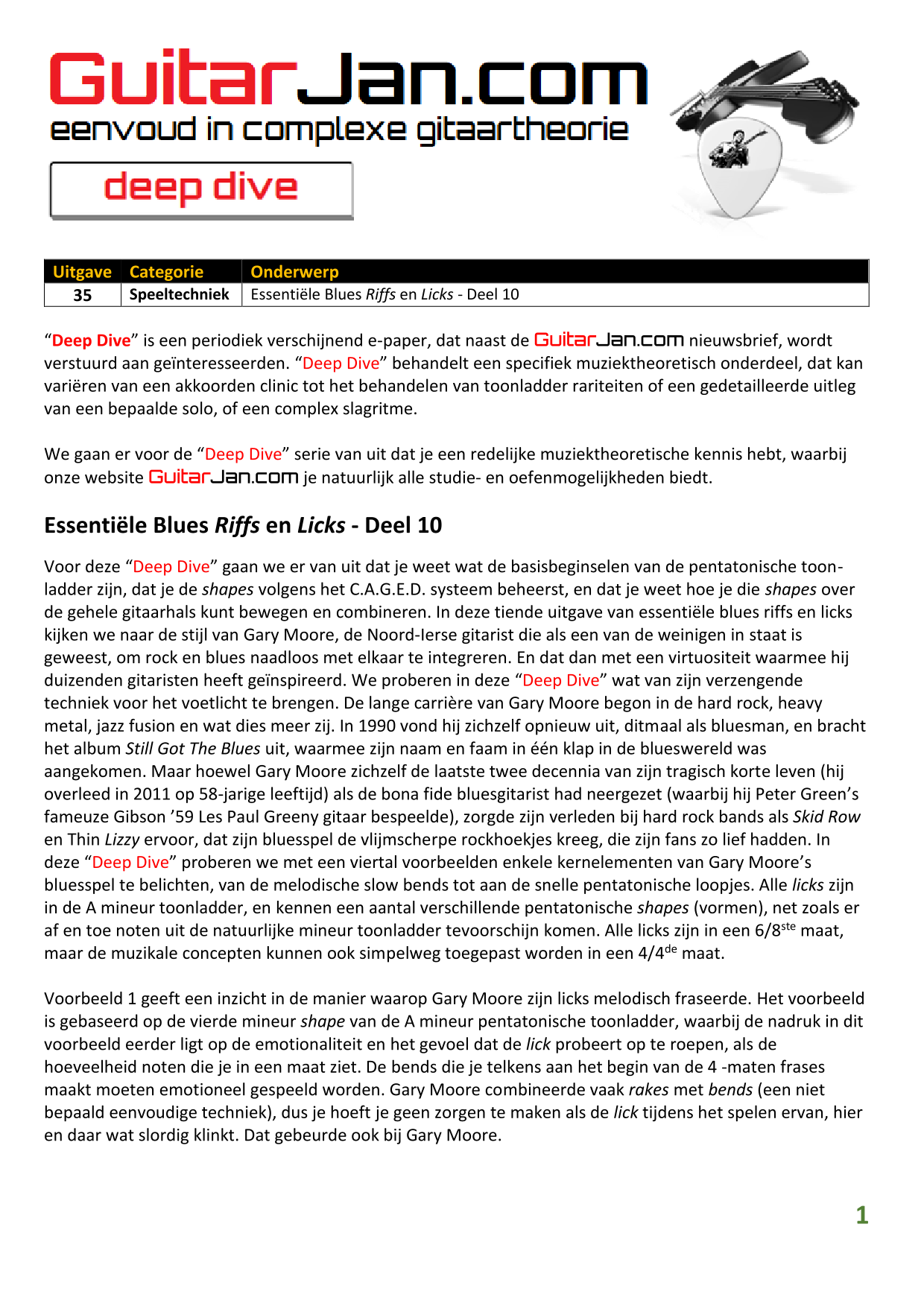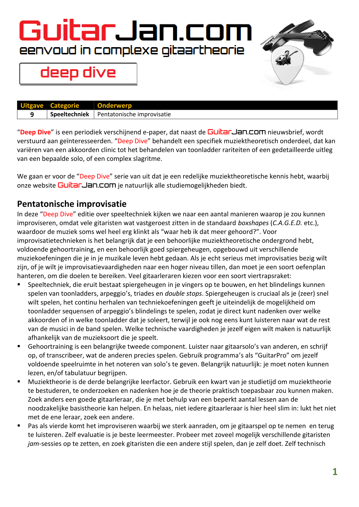 01 leren van andere instrumenten 02 Introductie in Sweep Picking 03 Bluessolo'S gebaseerd op riffs 04 Licks met vier vingers 05 Symmetrisch gebruik van notenpatronen 06 Orgelpunt (pedal point) licks 07 C.A.G.E.D. en 3NPS gecombineerd 08 Pentatonische substituties 09 Pentatonische improvisatie 10 Arpeggio's verfraaien 11 Mixolydische modus en de mineur terts 12 Stijlvolle bluessolo's 13 Tonale perfectie (pitch) 14 Het spelen van harmonische toonladders 15 Improvisatie over arpeggio's 16 Melodisch mineur en de mineur II-V7 progressie 17 Licks in shredded metal stijl 18 Oefenen zonder effecten 19 Old School blues intro 20 Diatonische arpeggio's 21 Improviseren met omkeringen 22 Solo's meer spanning geven 23 De Mixolydische toonladder en de kleine terts 24 Blues ritme combineren met basic licks 25 De A en G-Shapes in de mineur pent. toonladder 26 Essentiële blues Riffs en Licks - Deel 1 27 Essentiële blues Riffs en Licks - Deel 2 28 Essentiële blues Riffs en Licks - Deel 3 29 Essentiële blues Riffs en Licks - Deel 4 30 Essentiële blues Riffs en Licks - Deel 5