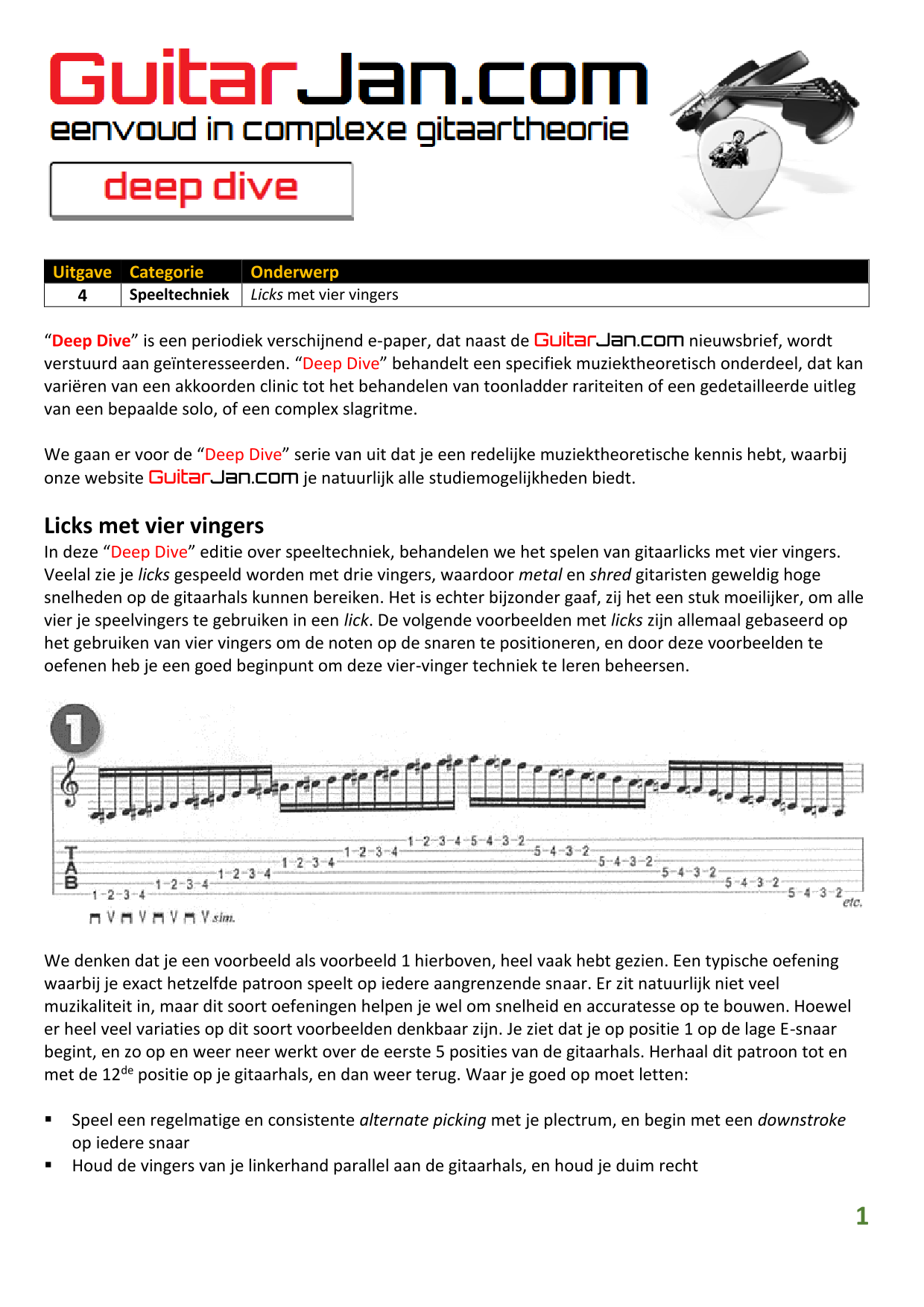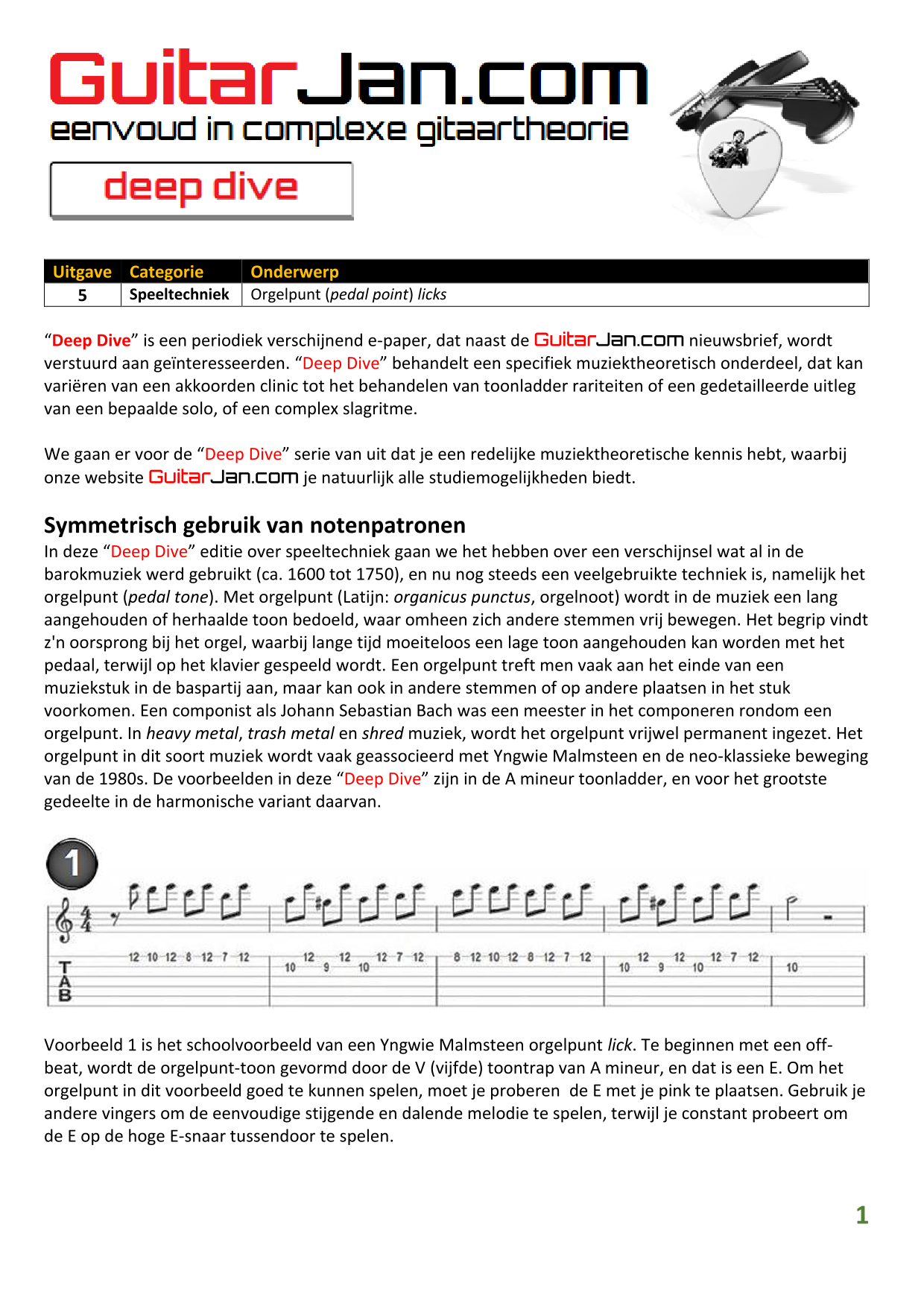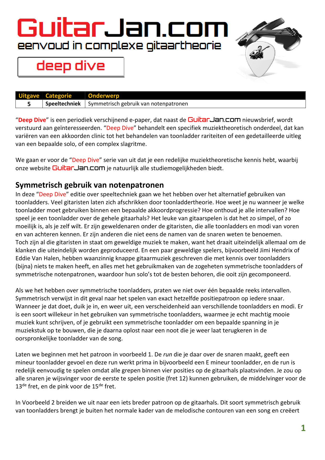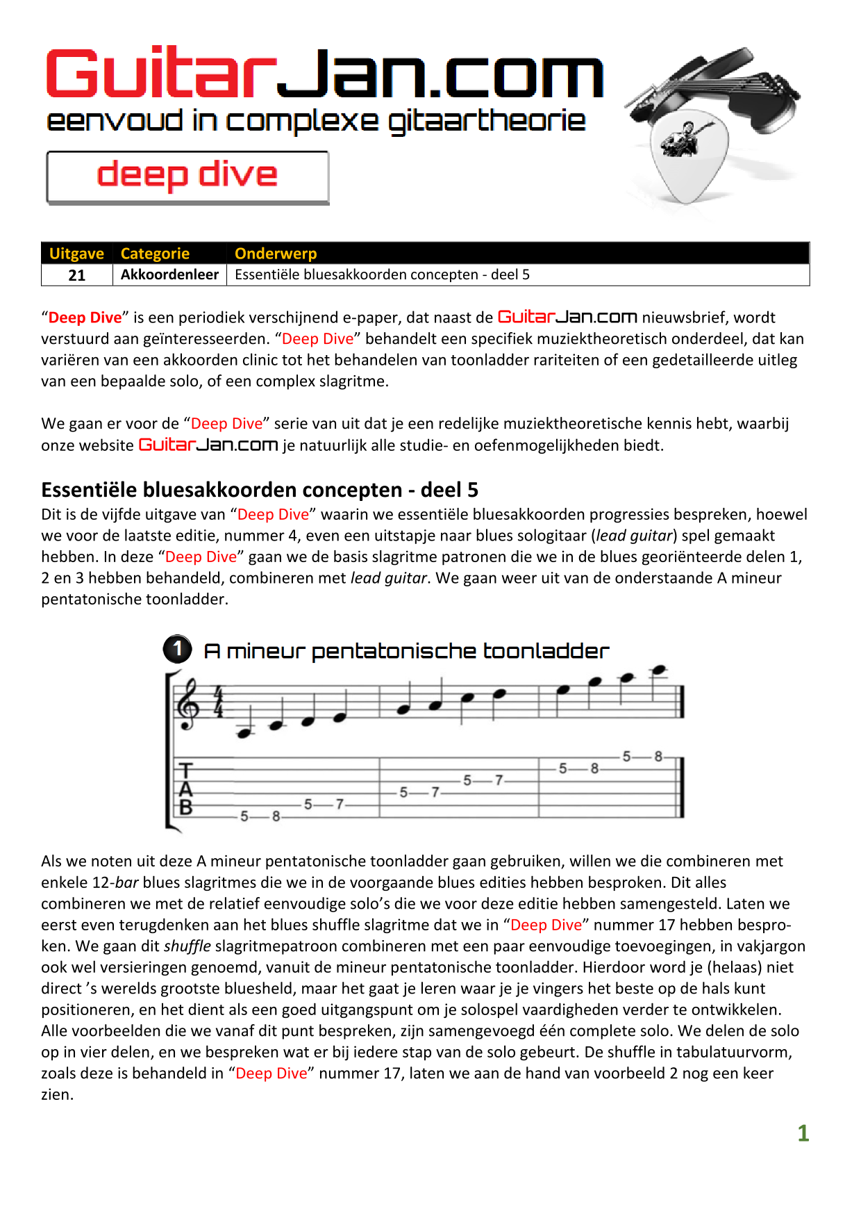 01 leren van andere instrumenten 02 Introductie in Sweep Picking 03 Bluessolo'S gebaseerd op riffs 04 Licks met vier vingers 05 Symmetrisch gebruik van notenpatronen 06 Orgelpunt (pedal point) licks 07 C.A.G.E.D. en 3NPS gecombineerd 08 Pentatonische substituties 09 Pentatonische improvisatie 10 Arpeggio's verfraaien 11 Mixolydische modus en de mineur terts 12 Stijlvolle bluessolo's 13 Tonale perfectie (pitch) 14 Het spelen van harmonische toonladders 15 Improvisatie over arpeggio's 16 Melodisch mineur en de mineur II-V7 progressie 17 Licks in shredded metal stijl 18 Oefenen zonder effecten 19 Old School blues intro 20 Diatonische arpeggio's 21 Improviseren met omkeringen 22 Solo's meer spanning geven 23 De Mixolydische toonladder en de kleine terts 24 Blues ritme combineren met basic licks 25 De A en G-Shapes in de mineur pent. toonladder 26 Essentiële blues Riffs en Licks - Deel 1 27 Essentiële blues Riffs en Licks - Deel 2 28 Essentiële blues Riffs en Licks - Deel 3 29 Essentiële blues Riffs en Licks - Deel 4 30 Essentiële blues Riffs en Licks - Deel 5