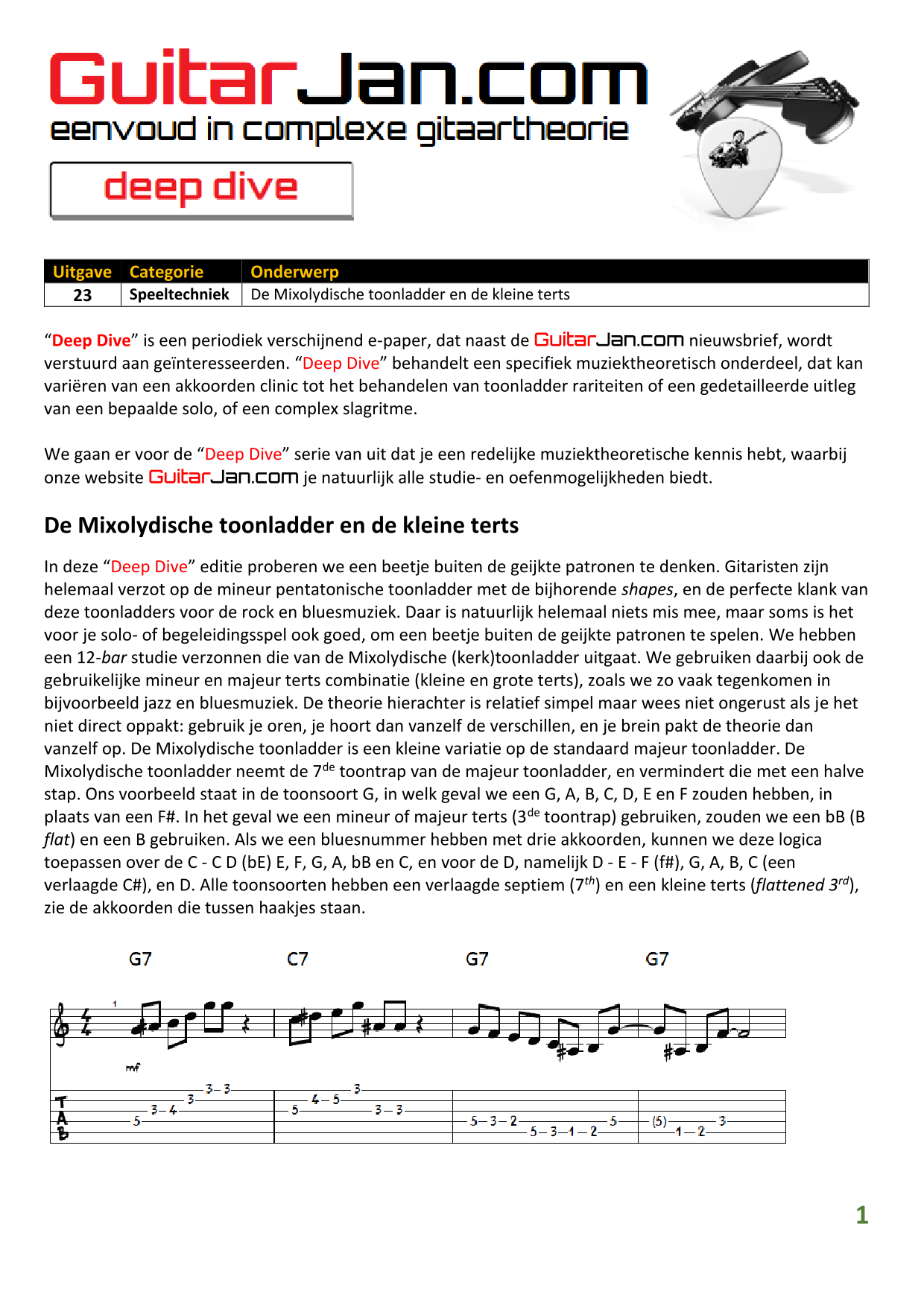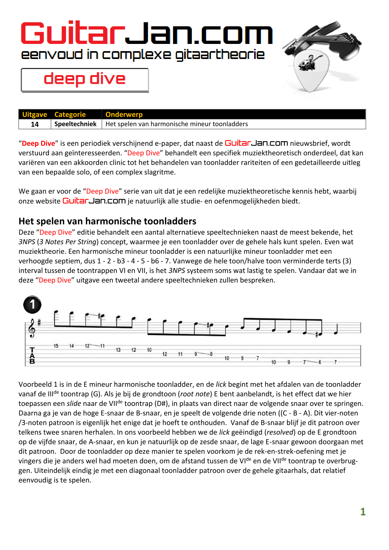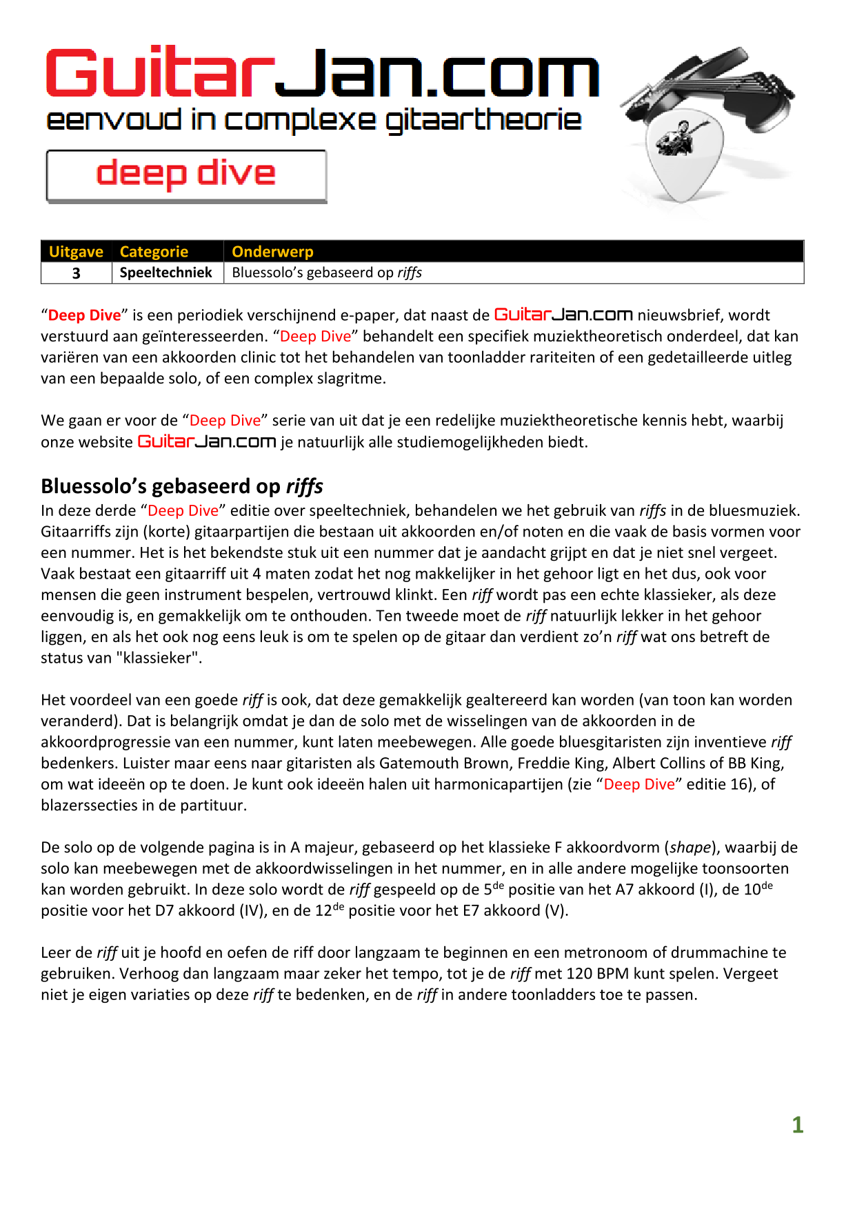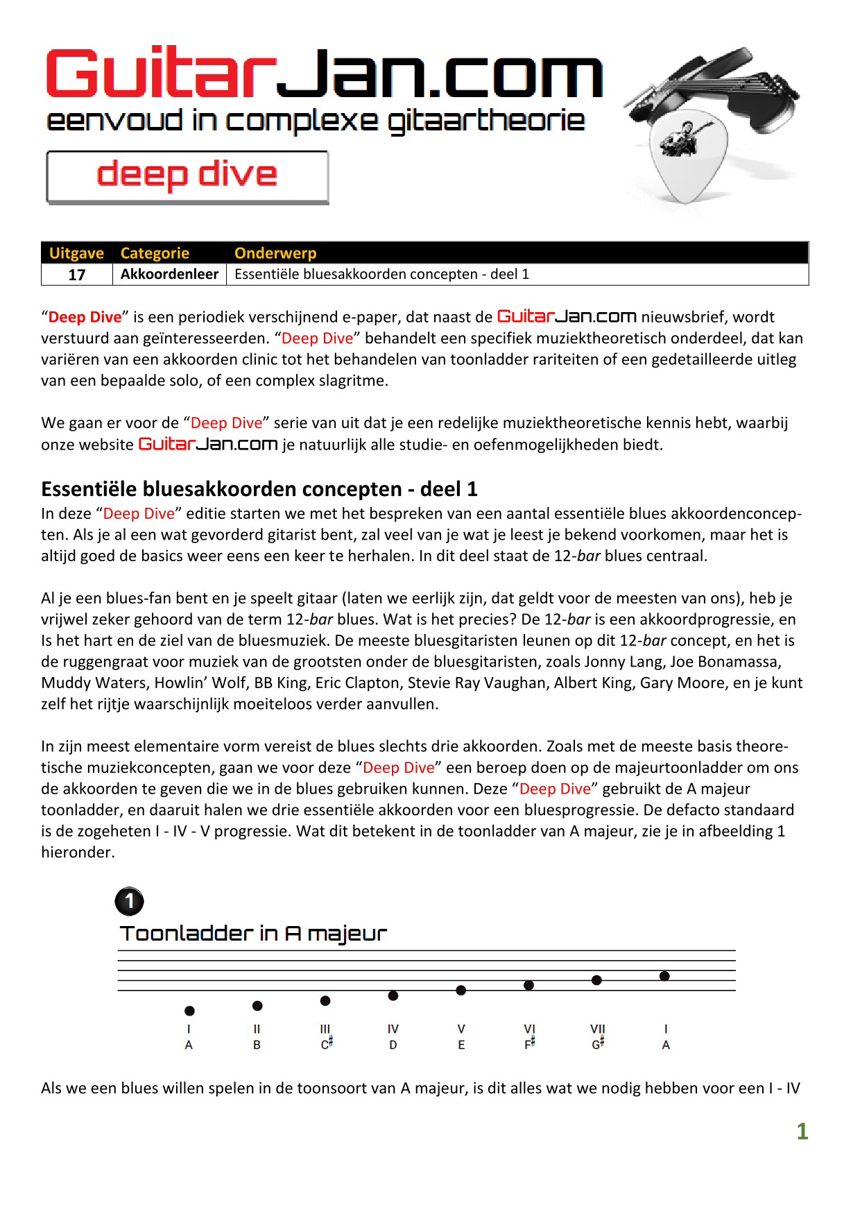 01 leren van andere instrumenten 02 Introductie in Sweep Picking 03 Bluessolo'S gebaseerd op riffs 04 Licks met vier vingers 05 Symmetrisch gebruik van notenpatronen 06 Orgelpunt (pedal point) licks 07 C.A.G.E.D. en 3NPS gecombineerd 08 Pentatonische substituties 09 Pentatonische improvisatie 10 Arpeggio's verfraaien 11 Mixolydische modus en de mineur terts 12 Stijlvolle bluessolo's 13 Tonale perfectie (pitch) 14 Het spelen van harmonische toonladders 15 Improvisatie over arpeggio's 16 Melodisch mineur en de mineur II-V7 progressie 17 Licks in shredded metal stijl 18 Oefenen zonder effecten 19 Old School blues intro 20 Diatonische arpeggio's 21 Improviseren met omkeringen 22 Solo's meer spanning geven 23 De Mixolydische toonladder en de kleine terts 24 Blues ritme combineren met basic licks 25 De A en G-Shapes in de mineur pent. toonladder 26 Essentiële blues Riffs en Licks - Deel 1 27 Essentiële blues Riffs en Licks - Deel 2 28 Essentiële blues Riffs en Licks - Deel 3 29 Essentiële blues Riffs en Licks - Deel 4 30 Essentiële blues Riffs en Licks - Deel 5
