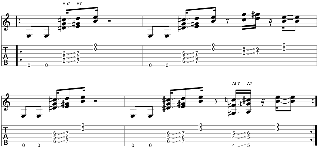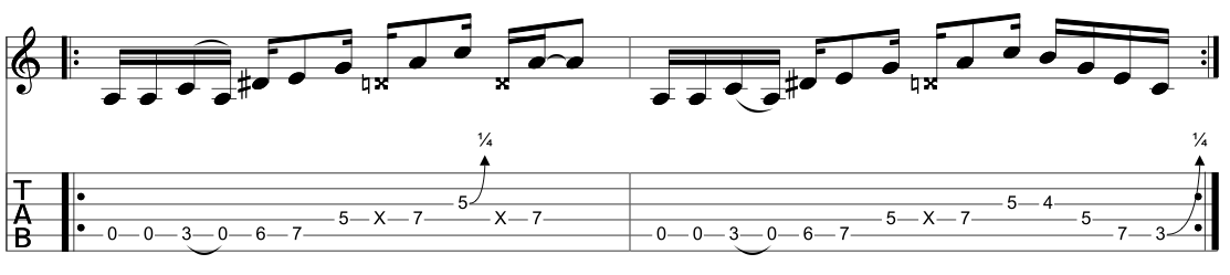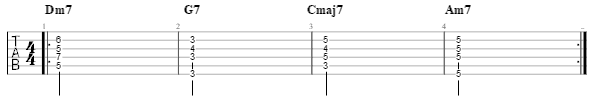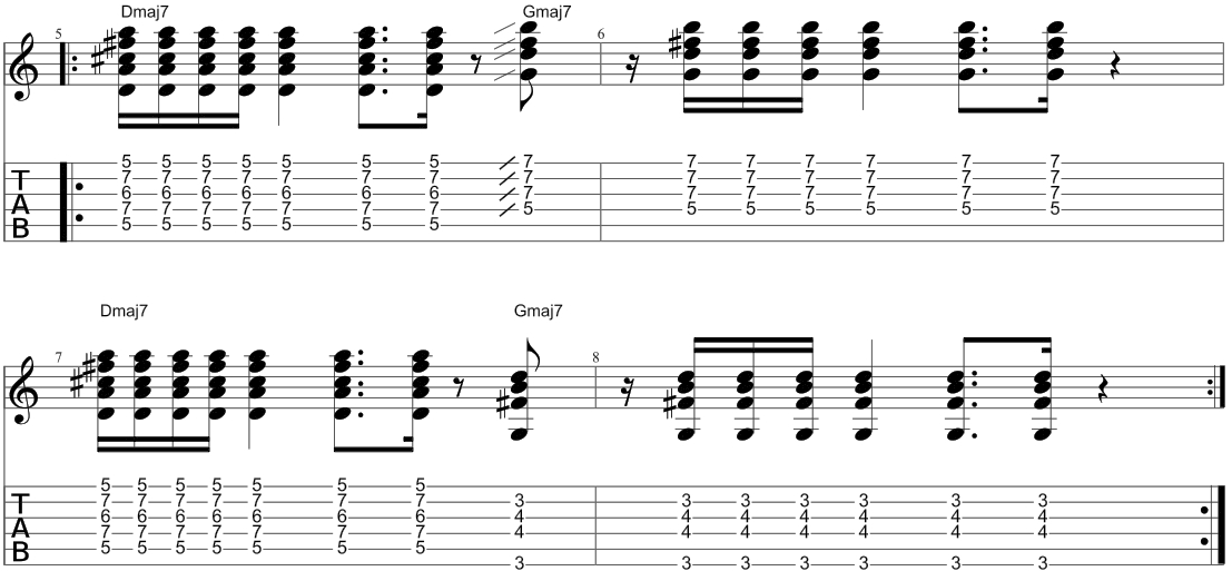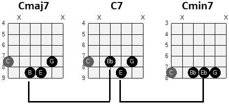 We transponeren het Cmaj7 akkoord met de grondtoon op de 6de snaar, de lage-E snaar, naar een drietal posities terug, en vooruit op de