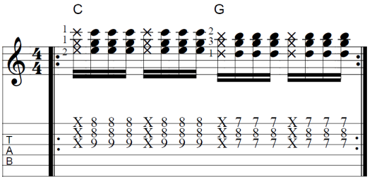 grondtoon wordt daarbij gespeeld door de positie met de duim van je linkerhand te spelen, de andere noten in het akkoord met de vingers 1, 2 en 3, oftewel