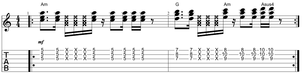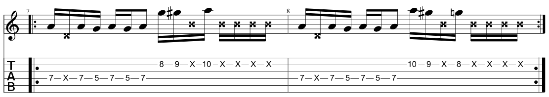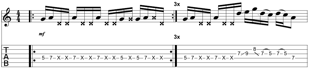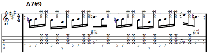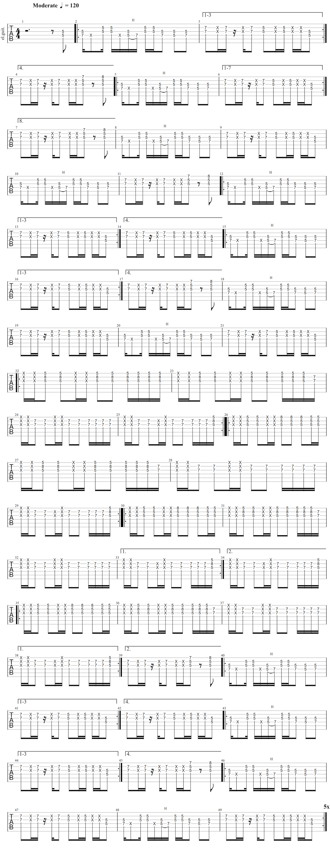 verdeeld is in ritmes van 16de noten. Dat wordt versterkt door accenten en "riffs" (ritmisch loopje) die de andere instrumenten als elektrische