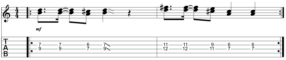 Hiernaast zie je hoe het ene akkoord in het andere akkoord overgaat, door het aanpassen van slechts één noot. Dit kan je helpen bij