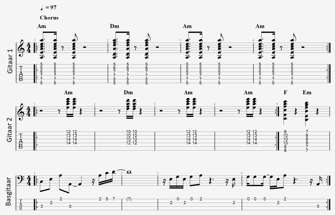 Je ziet in deze beginmaten van het nummer dat binnen de vierkwartsmaat de twee electrische gitaren en de basgitaar,