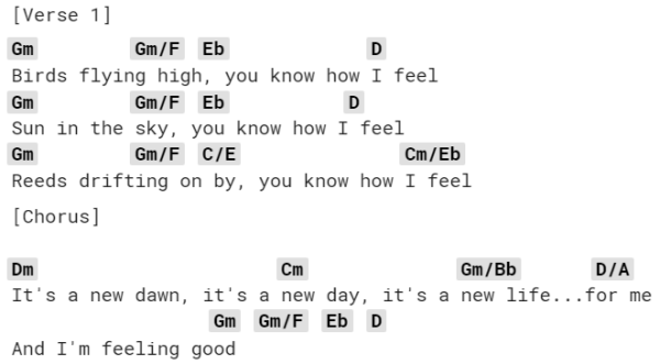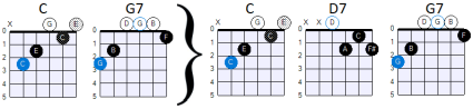 Dus je krijgt in totaal het volgende akkoordenprogressie-schema: C F G C Em C D G.