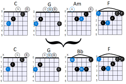 Daarnaast moet je nog weten dat als je de noten vertaald naar akkoorden, een majeur toonladder (in ons geval de F majeur toonladder)