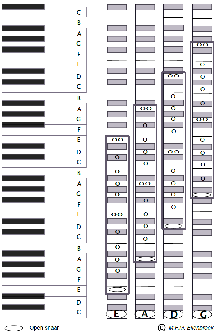 De illustratie hierboven laat zien op welke manier je de stamtonen vanaf een piano toetsenbord koppelt aan de hals van een