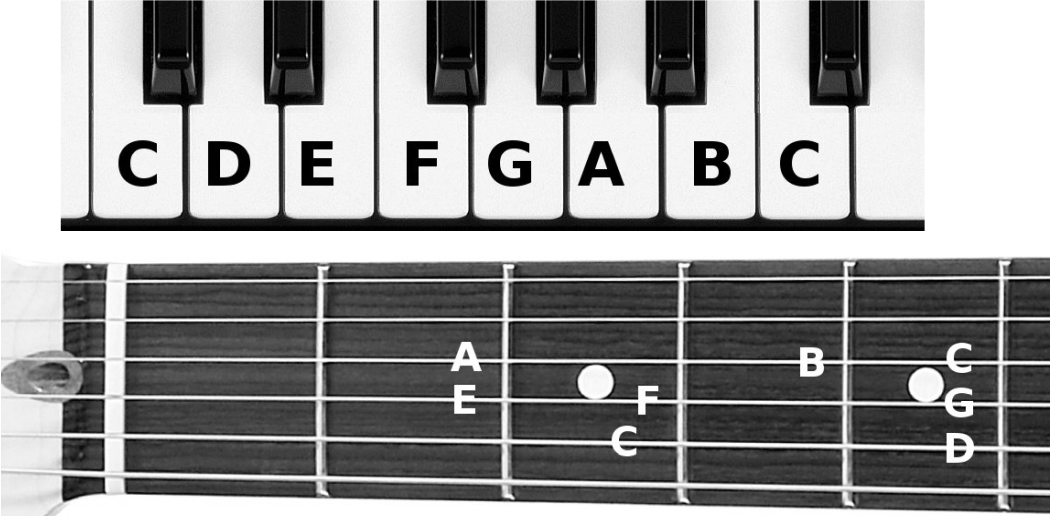 Op je gitaarhals is iedere fret een ½ stap,dus ga je van een C naar een D, dan zit daar volgens het piano toetsenbord een