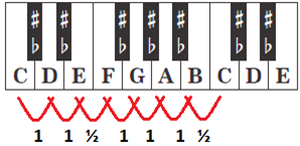 Als je alleen de tonen van de witte toetsen gebruikt en als je stelt dat een toonladder alleen maar uit hele en halve