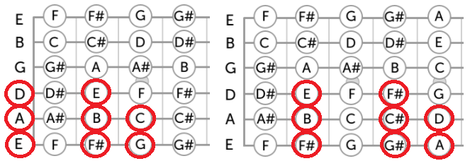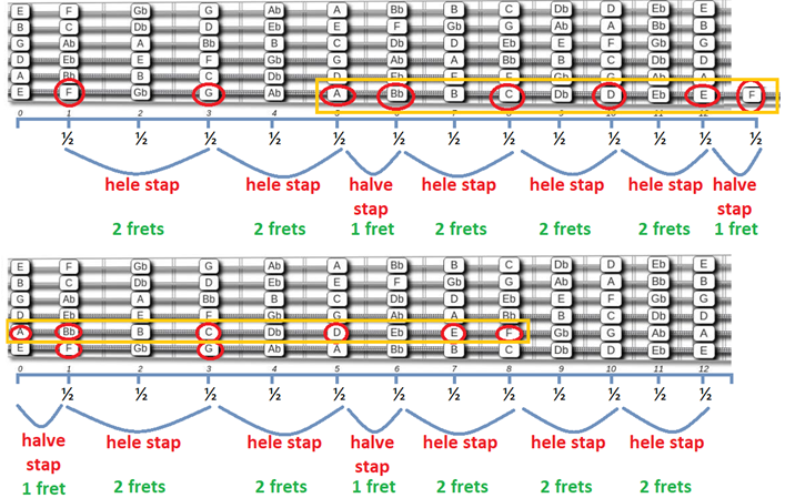 Als je duidelijk is, hoe de logica van je gitaarhals qua noten in elkaar steekt (zie anders nog even bovenstaande afbeeldingen),