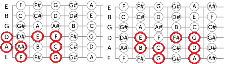| Dm | 1 x ♭ | D | E | F | G | A | B♭ | C | D |