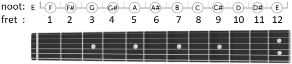 Dus: zit je op fret 5 en tel je terug naar fret 4, dan heet de noot op fret 4 een E♭ (Es), tel je van fret 3 naar