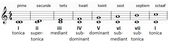 | Octaaf | octave | eerste naar achtste (C naar eerstvolgende C) |