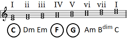 F Gm Am B♭ C Dm Em F, zie de Romeinse cijfers bij de toontrappen.