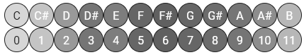 melden dat er hele stappen tussen twee stamtonen zitten (aangeduid met 1), als er een zwarte toets tussen zit. Als er geen