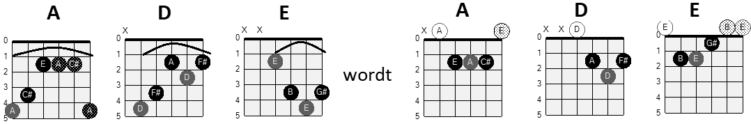 De akkoorden A, D en E klinken dan een octaaf lager, maar hebben precies dezelfde klankkleur als dezelfde akkoorden A, D en E, die met een Capo