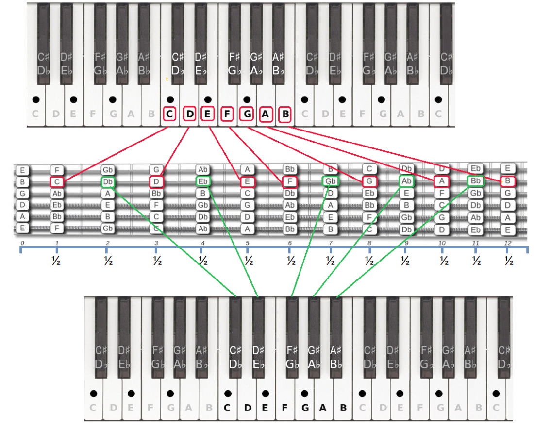 De 7 stamtonen vanaf het piano toetsenbord naar de gitaarhals zijn met rode lijnen gekoppeld, de tussenliggende halve tonen