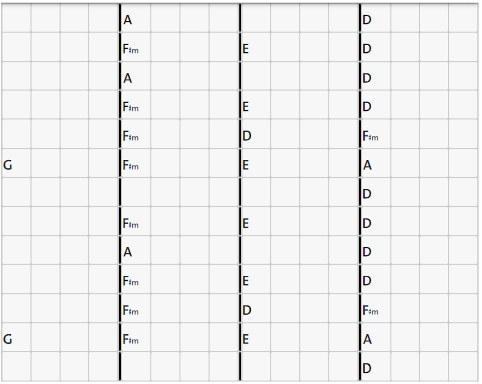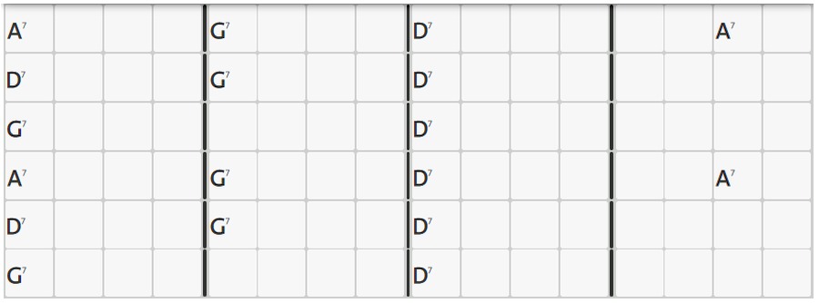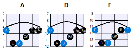 Als we een I - IV - V akkoordprogressie willen spelen, dan hebben we de volgende akkoorden: A, D en E (allen majeur akkoorden), zie de tabel