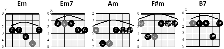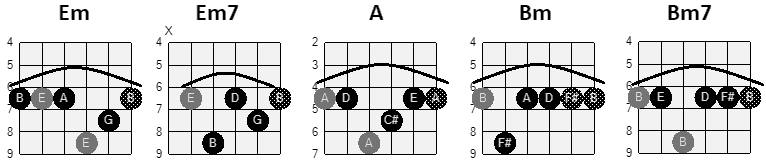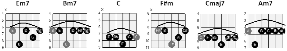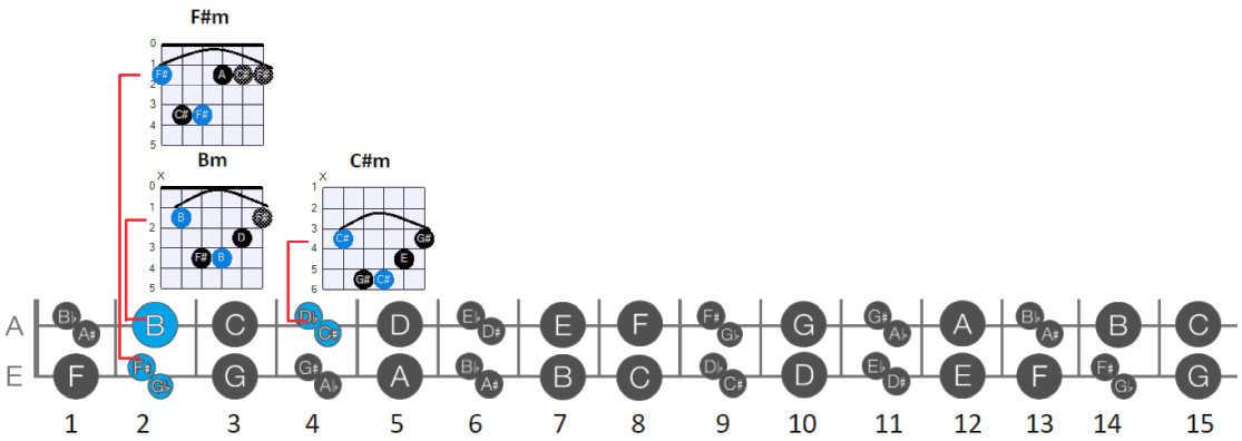 Dat betekent, dat je de akkoordprogressie I - IV - V in F♯ mineur ook op die posities kunt spelen.