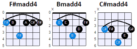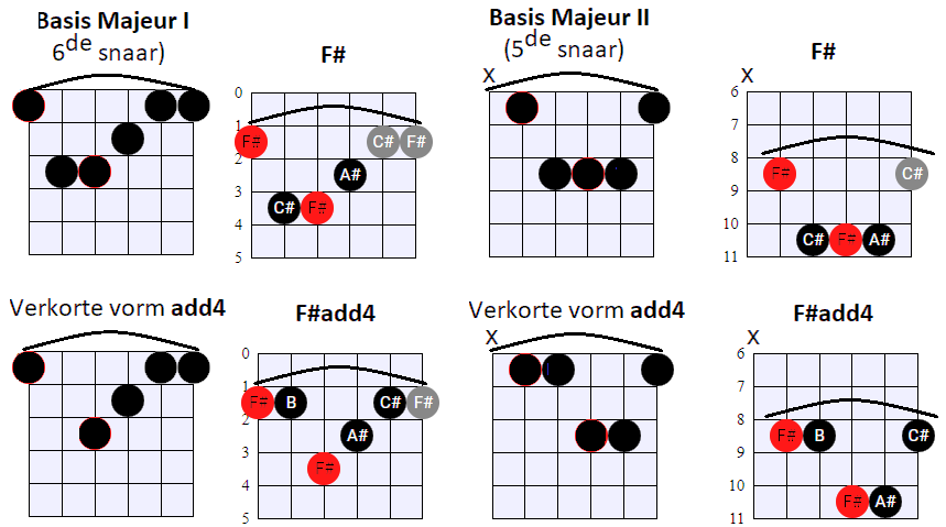 Je ziet de oorspronkelijke barré akkoorden op die posities hierboven links, met hun verkorte add4 vorm daaronder.