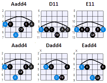 Door de A Majeur Shape door een Aadd4 Shape te vervangen, en de D en E Shapes door respectievelijk een D11 en een E11 akkoord (Shape), wordt