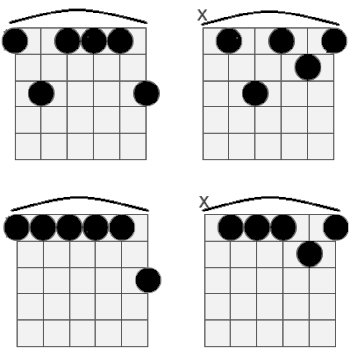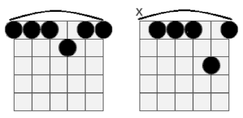 van de 6de snaar (de lage E snaar), de tweede variant laat het akkoord beginnen op de 1ste positie van de 5de