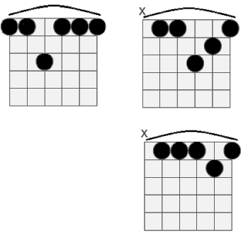 Hiernaast zie je, dat je met één barré Shape, alledrie de akkoorden kunt spelen. Je verschuift alleen maar je