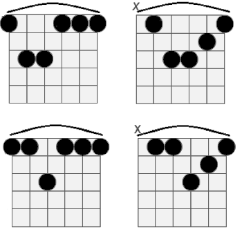 ook zullen we bij iedere barré Shape/akkoord een "verkorte" versie geven, in het Engels een "substitute chord" genaamd.