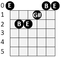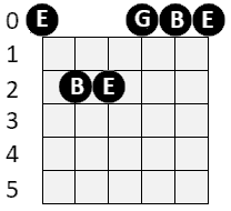 blauw weergegeven in de akkoorddiagrammen), koppelen aan de 6de snaar (de lage-E snaar) van de gitaar. Dat ziet er voor de eerste