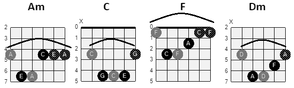 vingers nodig heeft. Uiteraard wordt de wijsvinger in alle gevallen gebruikt om de barré te maken. Je zou de akkoordprogressie van hierboven ook