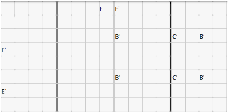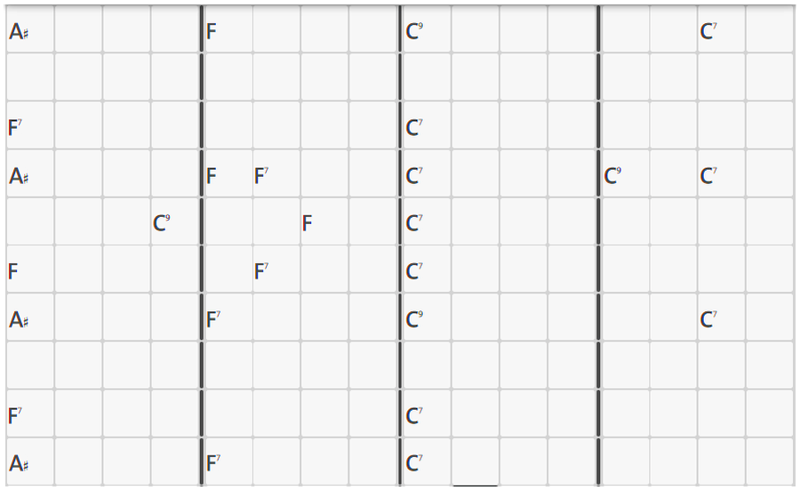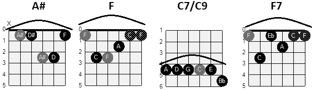I, IV en V de volgende akkoorden: B♭, E♭ en een F. Als je met de bovenstaande Shape wilt doorgaan dan kan dat, de B♭ zit op