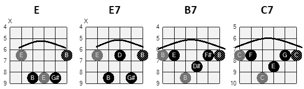 speelhand van de 5de naar de 10de en daarna de 12de positie, en je kunt de complete akkoordprogressie heel