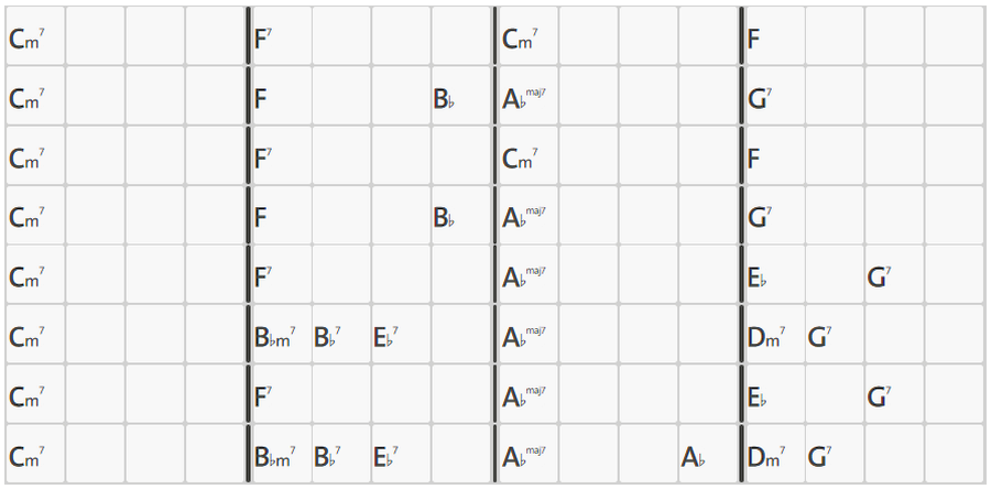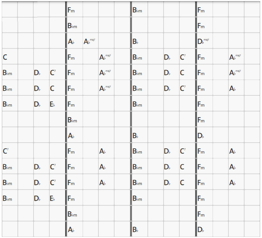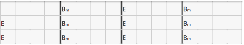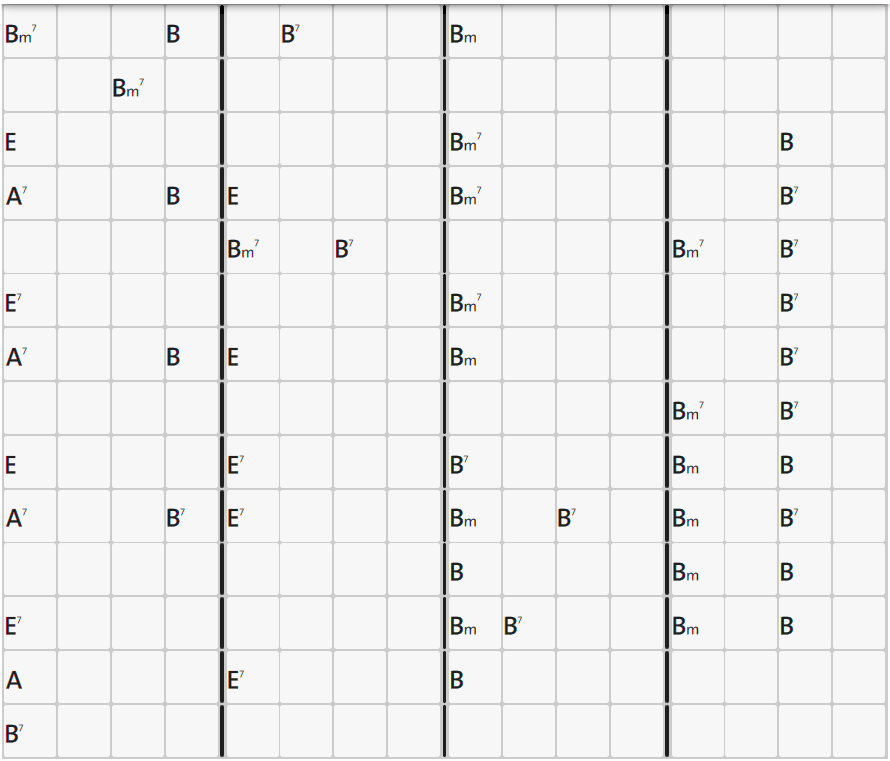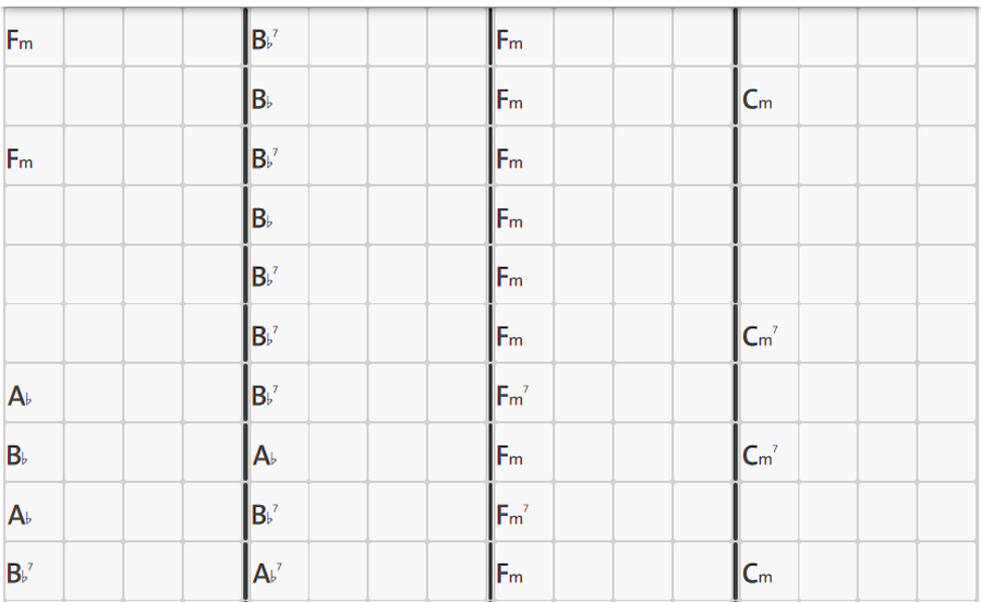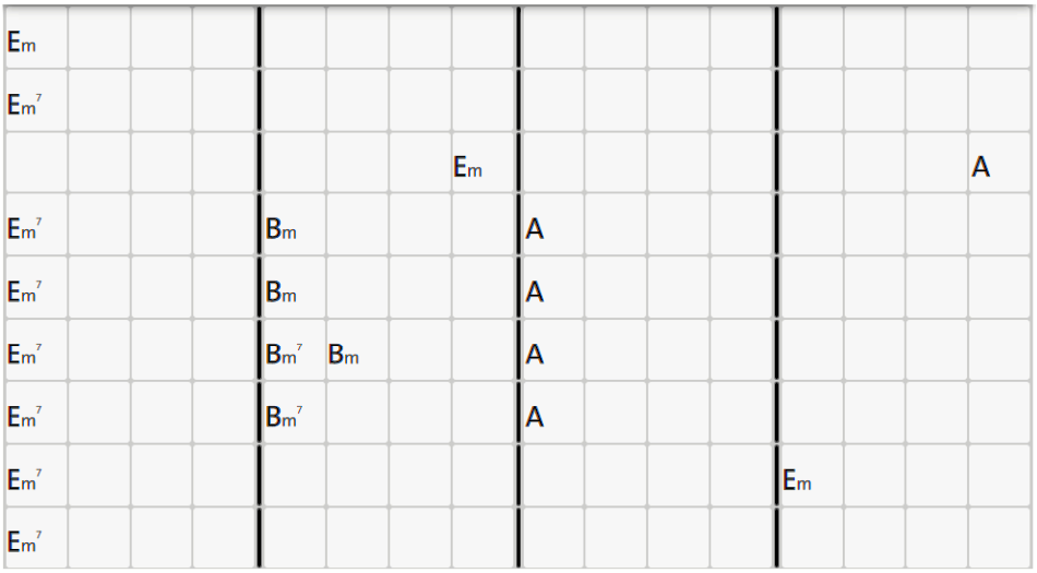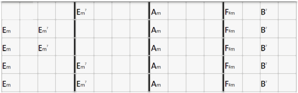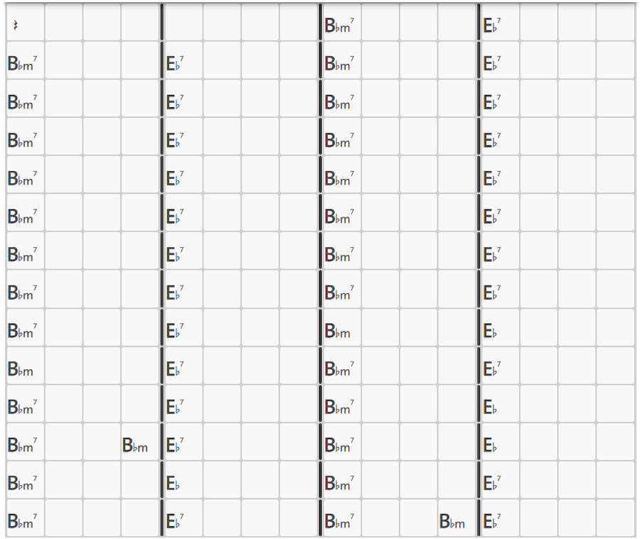 Om je goed op weg te helpen bij het meespelen met de backing tracks hebben we, in "Chordify"-vorm, een "meespeel"-schema