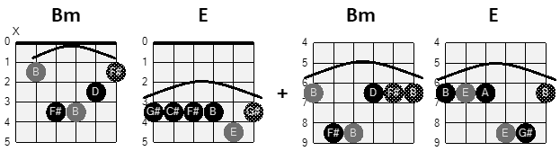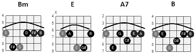 F♯ op de 2de positie staat. De voor de akkoordprogressie I - IV - V benodigde B mineur kun je ook op de 2de