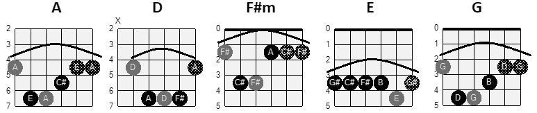 Het A majeur akkoord naar het D majeur akkkoord op dezelfde positie van de hals blijft, de 5de fret, maar je moet wel je vingers
