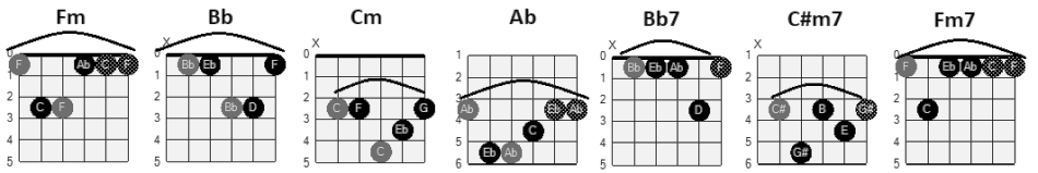 Om de verschuifbare barré akkoorden nog wat verder te verduidelijken, nu een voorbeeld vanuit de F♯ mineur toonladder.