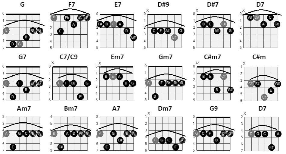 Bij veel akkoordprogressies die we bij de backing tracks hebben uitgeschreven, vind je soms meer dan 10 barré akkoorden. Heel vaak kun